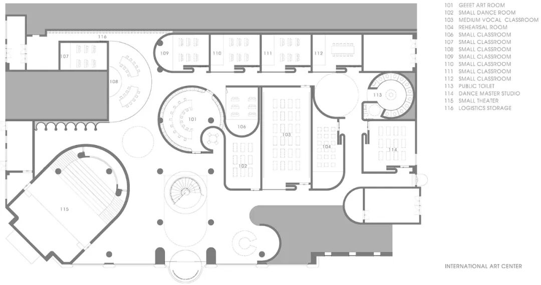 根据功能需要,我们对声量分贝进行了调整,并递进地安排了课室团组。在首层,入口左侧是小剧场,它独立分布,既有独立方位,又有散场人流的空间。中间是舞蹈课室团组,而最深入内部则是安静的小课室团组。