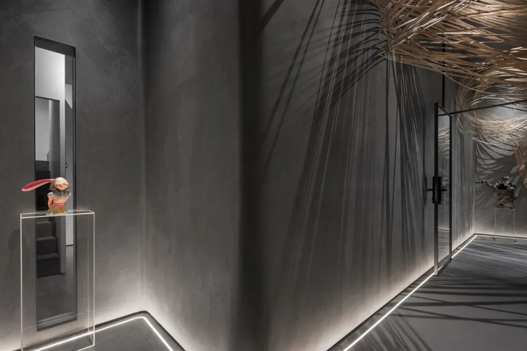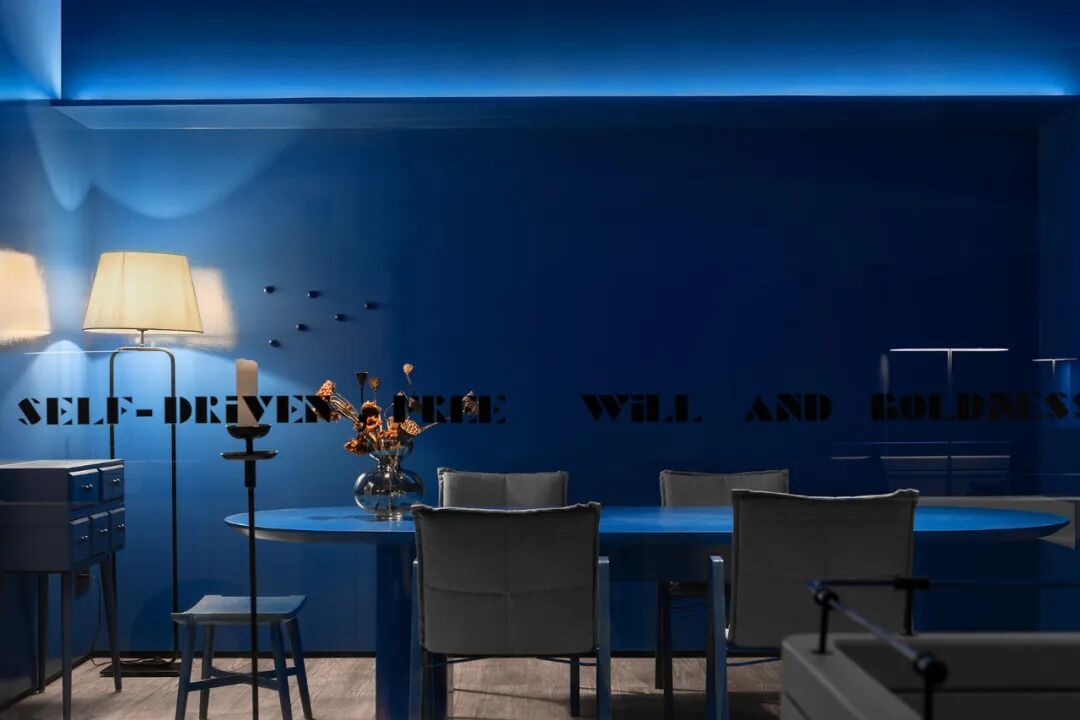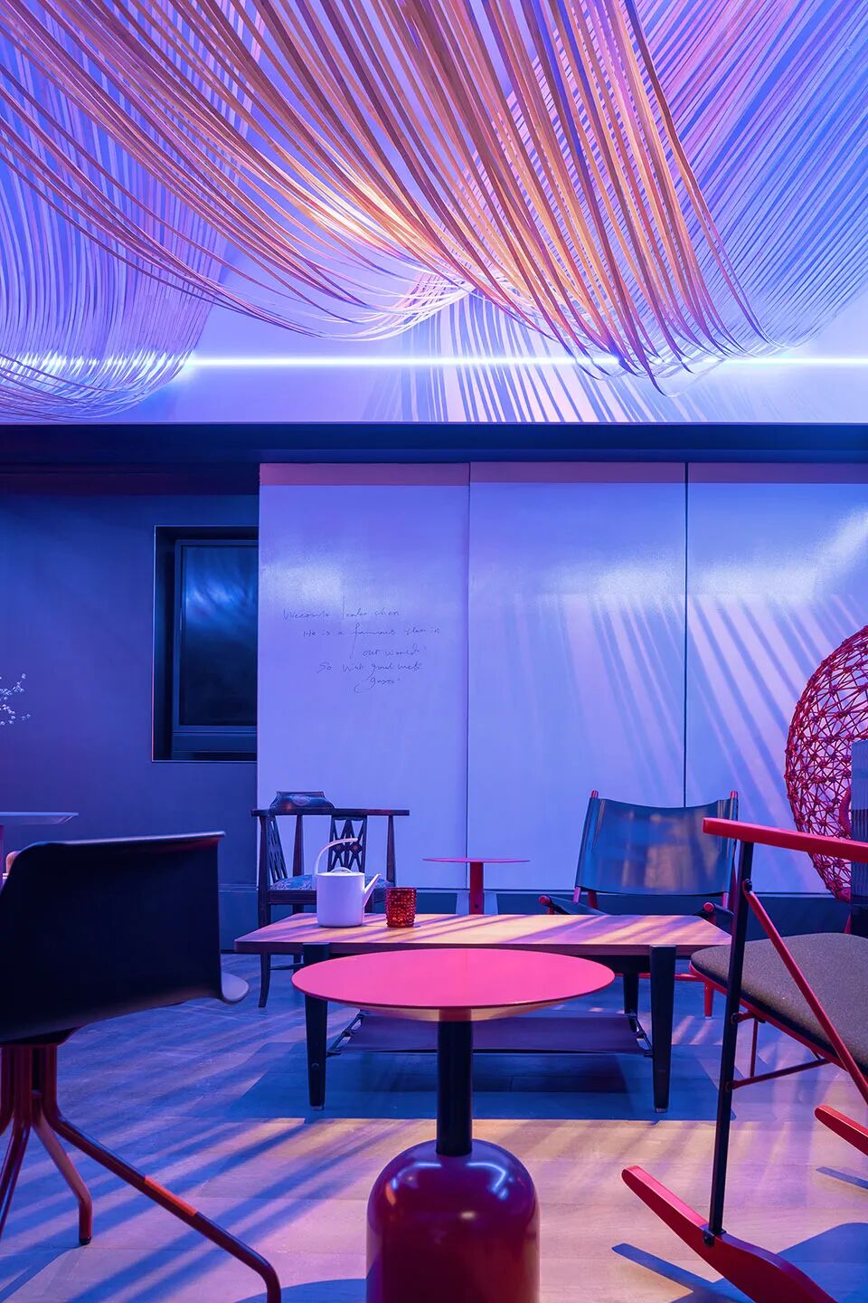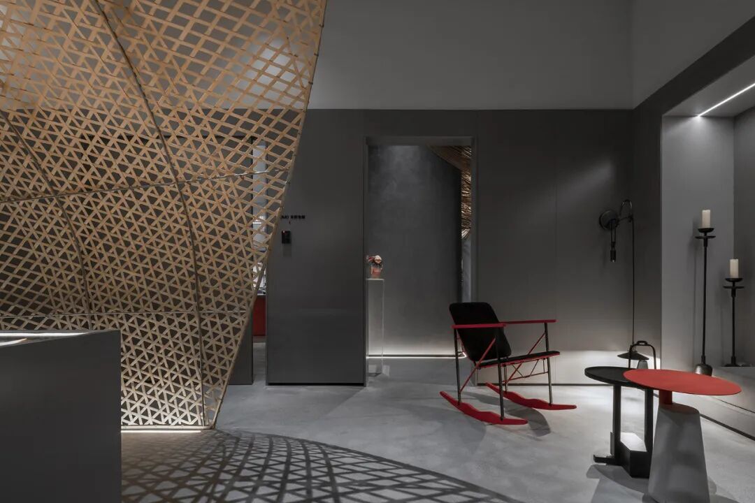 基于以上的“三性”,我们在空间的不同区域进行了不同体验感的设计。例如,“进窄门,走远路,见微光”的主题入口;长约21米的“T”台长廊;集酒吧、咖啡吧、茶吧、餐吧和自由交谈区的综合吧;以及一个“项目档案中心”的接待中心。
