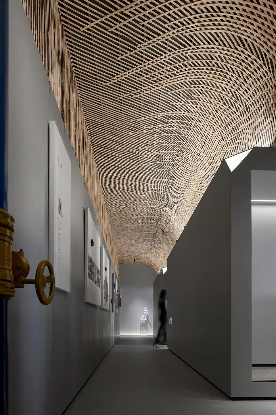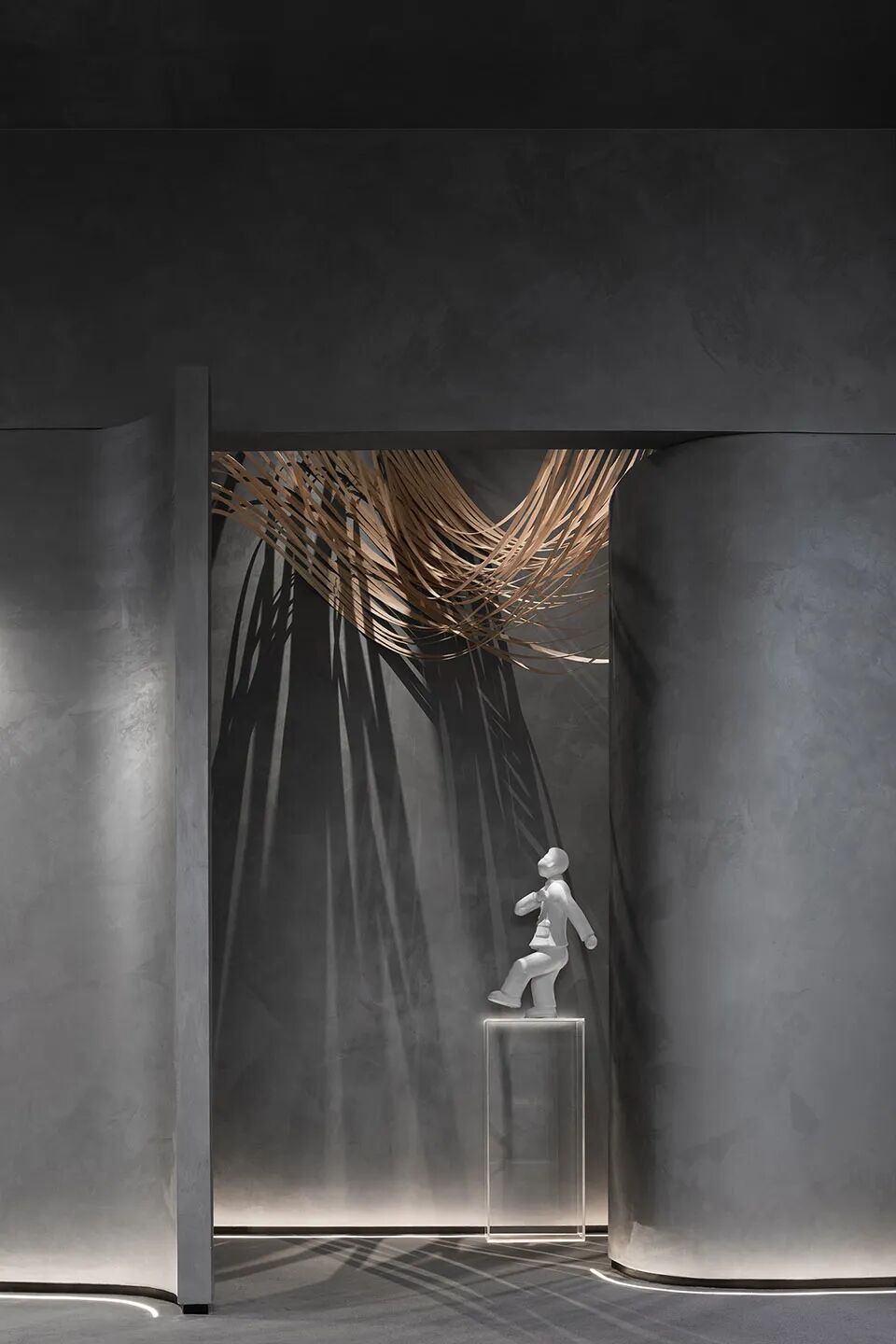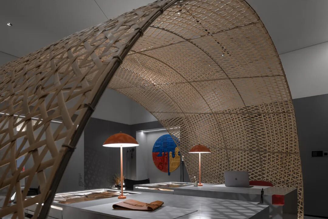 竹编装置是本方案的重要元素,在不同的空间中以不同的形式得到呈现。它们在主题入口和综合吧的顶部呈现曲折回转的延伸造型,使空间充满生机。在“T”台长廊的顶部形成大规模阵列,增添了空间的层次感。在方案孵化中心和接待中心形成围合,清晰地划分了空间的界限。