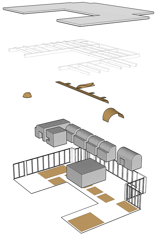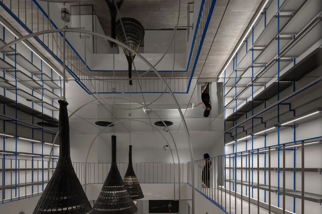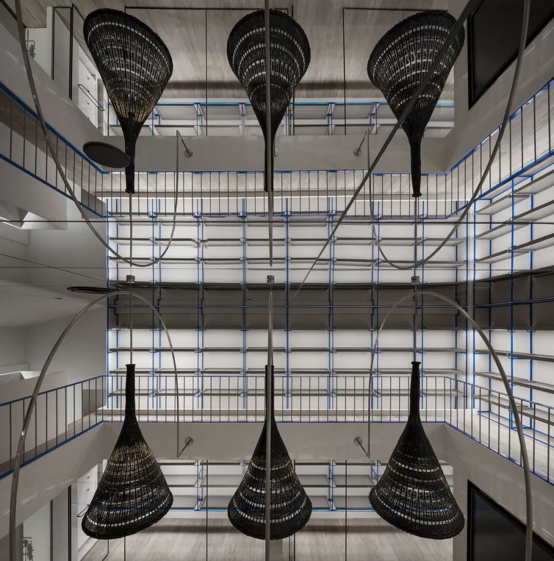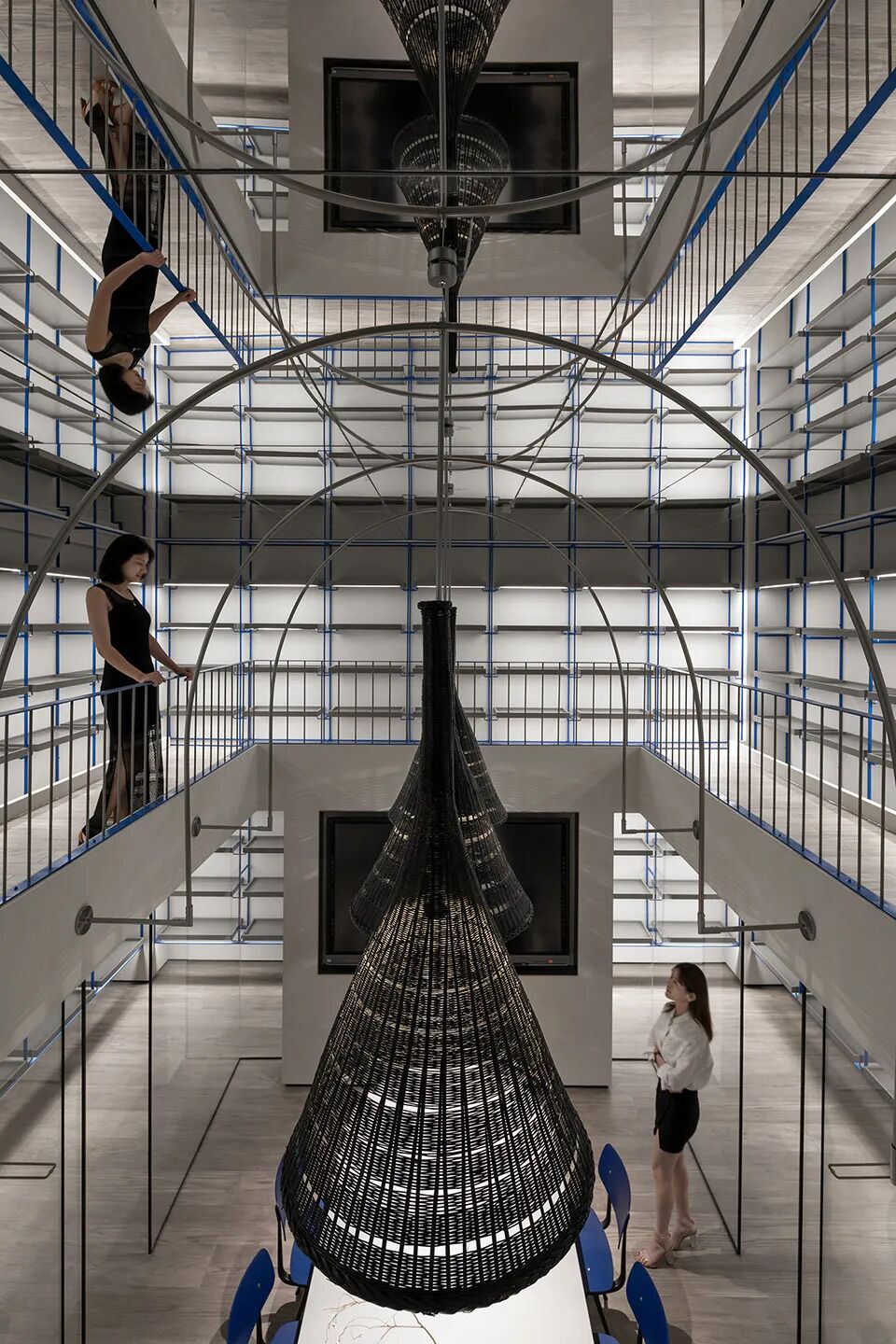 竹编装置是本方案的重要元素,在不同的空间中以不同的形式得到呈现。它们在主题入口和综合吧的顶部呈现曲折回转的延伸造型,使空间充满生机。在“T”台长廊的顶部形成大规模阵列,增添了空间的层次感。在方案孵化中心和接待中心形成围合,清晰地划分了空间的界限。