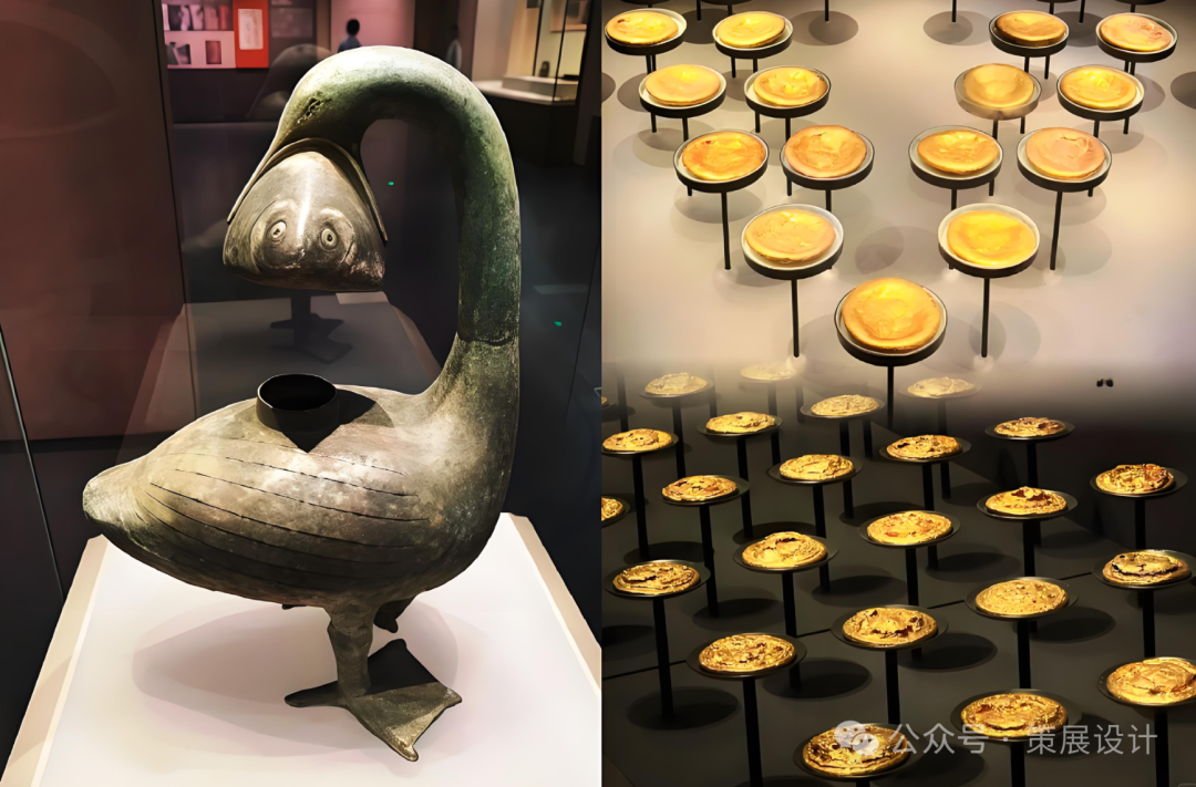 常州博物馆打破传统文物展的线性逻辑,以幽暗灯光与夯土肌理营造考古现场感;主展区通过错层布局与镜面反射,将金器阵列的视觉冲击力放大至极致;尾声处以数字幻影重现刘贺墓椁室“东寝西堂”格局,使观众仿佛置身于“黄肠题凑”的宏大叙事中。这种“空间即展品”的策展思维,让文物脱离了玻璃展柜的桎梏,成为激活历史想象的媒介。