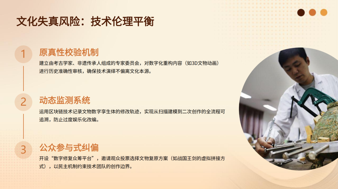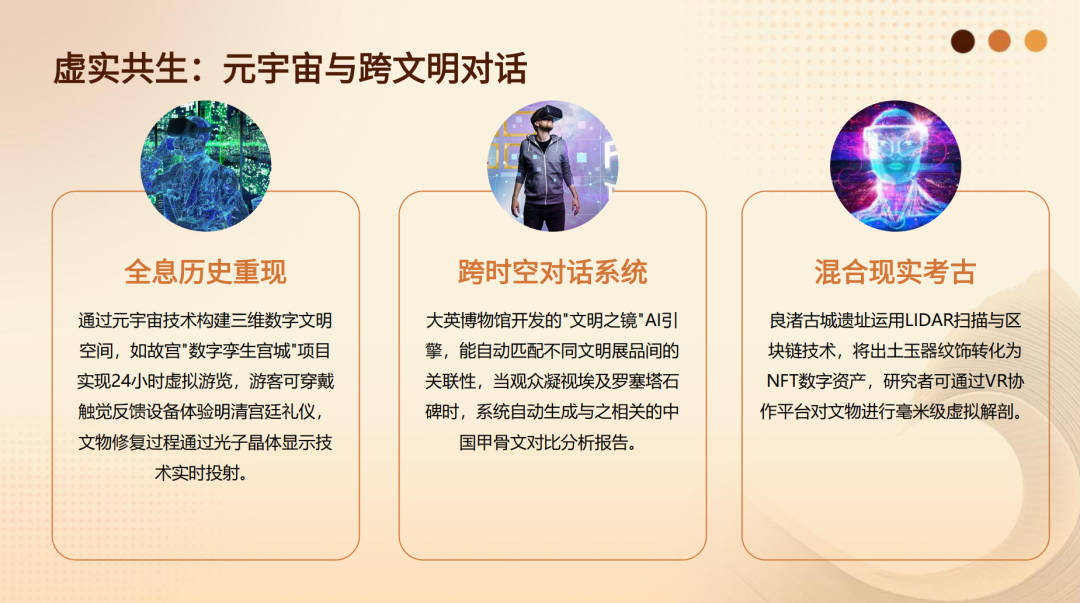 数字孪生博物馆 :游客可通过脑机接口进入虚拟博物馆,在元宇宙中亲手“修复”破损文物。AI算法根据用户操作生成修复方案,优秀作品可获得实体文物修复的参与资格。