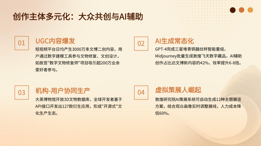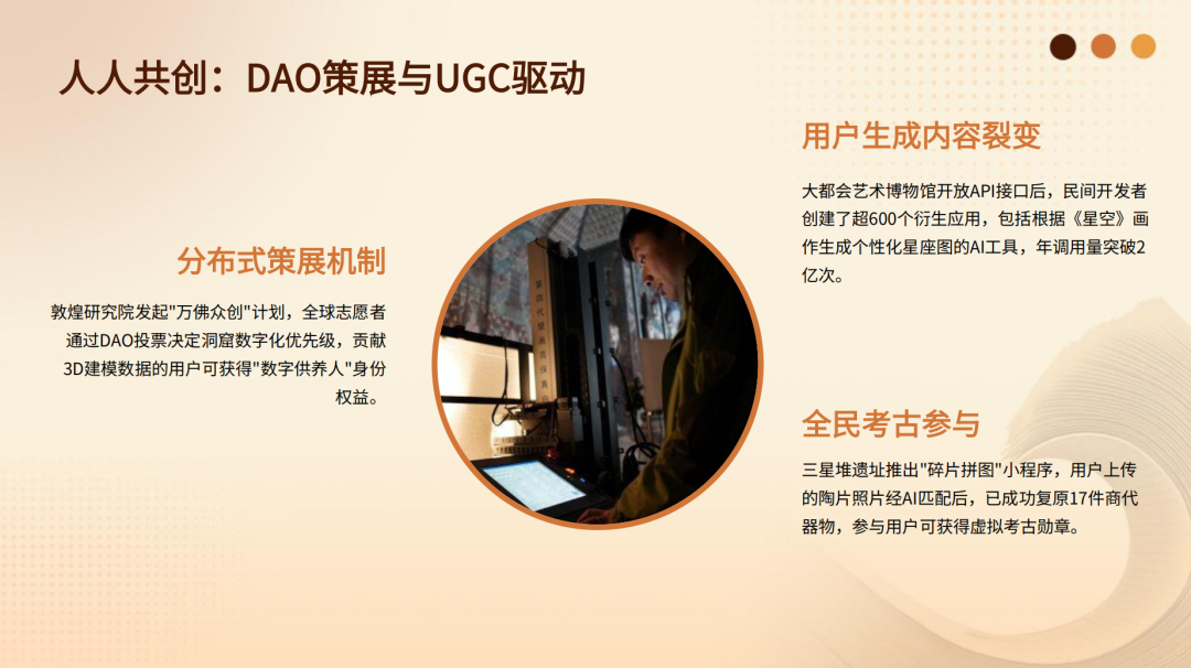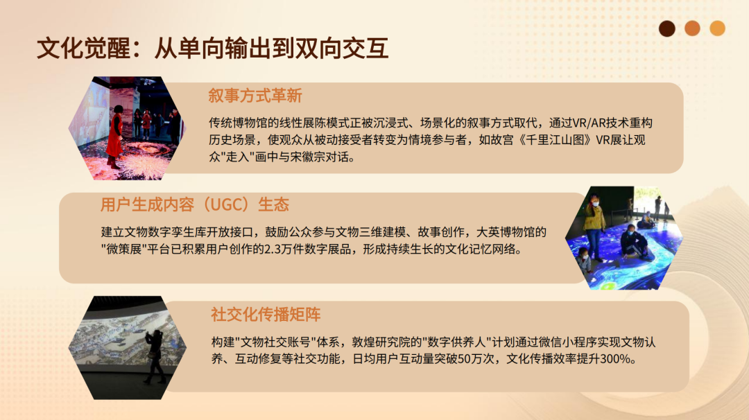 UGC驱动创新 :普通游客拍摄的文物短视频经AI优化后,可生成NFT数字资产在平台交易。故宫的“全民策展人”计划,已收到超10万条用户生成内容,其中3部作品入选年度特展。