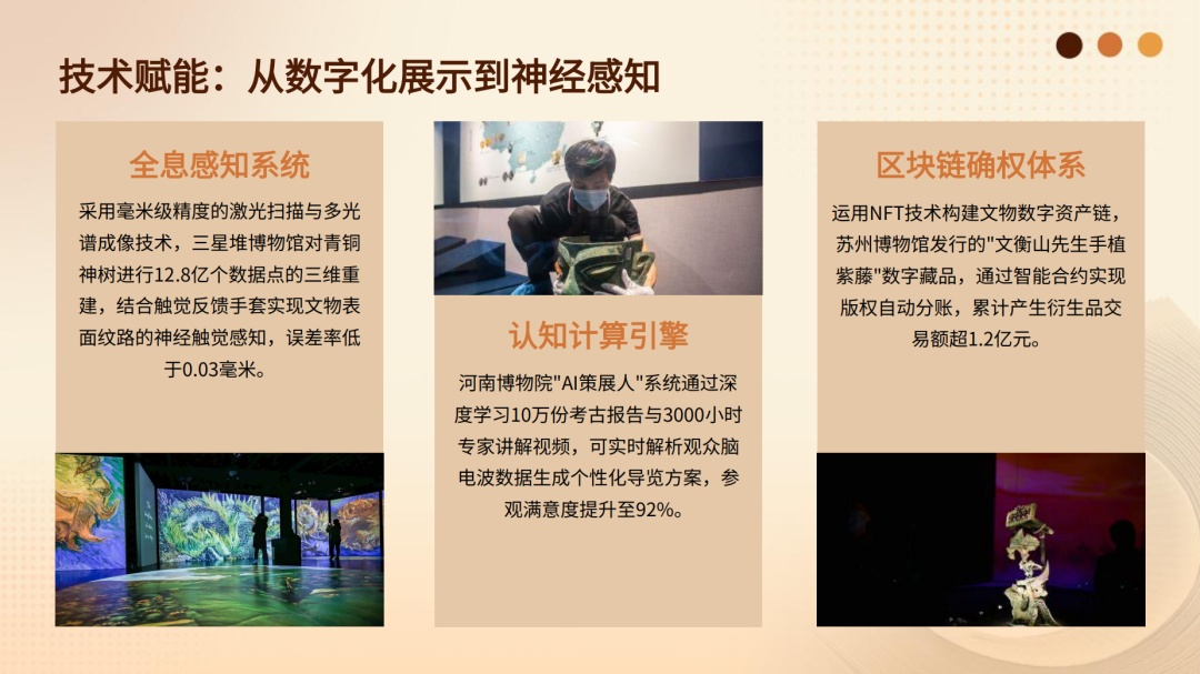 当故宫的琉璃瓦在虚拟现实中折射出赛博朋克的霓虹,当敦煌飞天的衣袂化作区块链上的数字像素,当考古现场的土层分析数据成为元宇宙的底层协议——我们正目睹一场跨越时空的文明重组。 博物馆 领域不再是尘封历史的象牙塔,而是以数字技术为锚点,以跨界融合为引擎,在虚拟与现实的交界处孵化出全新的文化生态。 这场变革的深层逻辑 , 在于将“文化记忆”转化为“数字资产”,用技术手段激活传统文化的“活性基因”,最终 构建一个虚实共生、人人参与的文化宇宙 。