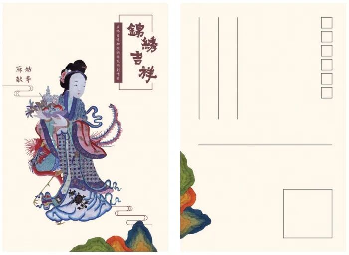 为此,策展团队设置了观众互动项目和配套的 社教课程。第一个观众互动项目是在展厅设置观众 绘画配色体验区(图3),团队将文物中的各种图 案都提取出来,并打印完放置于观众互动处,观众 可以用笔拓这些图案,然后自己涂色,作品完成后 可以盖展览专用章带走留作纪念,这个互动项目受 到了观众的喜欢;另一处观众互动项目是两排转轴 (图4),每个转轴上有三个面,上面分别印制了满 族民间刺绣展品中的各类图案,并标注吉祥图案的 名称,让观众在玩的同时了解中华传统吉祥文化; 第三,团队在展示墙旁边放置了多媒体展示屏,里 面输入了展示墙上的所有文物照片、名称以及图案 介绍(图5),以供观众阅览,加强观众对文物和吉 祥图案中吉祥寓意的了解。此外,还印制了展览明 信片(图6),选取的是麻姑献寿图案,免费送给观 众,进一步宣传展览和传统文化,让观众将展览、 文物、吉祥文化带回家。最后,团队还做了360°网 上展览,让观众可以线上观展。