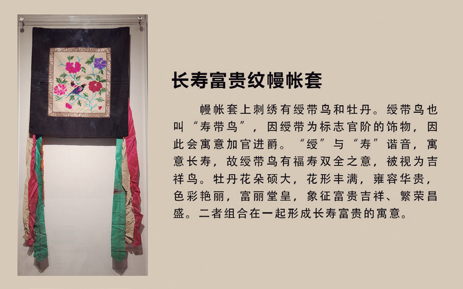 文物说明牌是观众了解展品的重要途径,团队人员在这次展览中也做了一些调整(图1)。一般文物说明牌都是在文物旁边摆放,但很多刺绣类文物面积较大,需要挂起来展示,文物说明牌如果也粘贴在展墙上不仅距离观众过远,而且会显得整个展墙很乱,为了让观众更清楚地将文物和说明牌对应起来,在设计文物说明牌的时候将文物也印了上去,而且对重点文物展开说明,这样就兼顾了整体的美观和观众的看展体验,让观众能迅速对应说明牌和文物并从中获取知识。