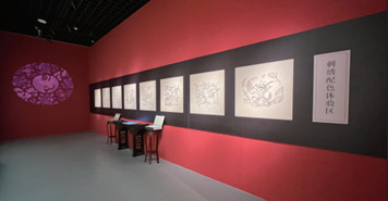 第四部分向观众展示了满族民间刺绣中会用到的绣法,包括补绣、锁绣、平绣、盘金绣、纳纱绣、打籽绣、割绣等。吉林省博物院收藏的满族民间刺绣品涵盖了以上绣法,其中补绣类藏品最多。很多刺绣手法都源自汉族,满族妇女在学习各种刺绣技法的同时结合本民族特色又加以了创新,形成了满族原生态补绣绣法。满族补绣也称“拨云绣”“剪贴绣”,先按照图案形状剪下布料,再将其粘贴在其他布料上,之后用棉线补缝而成,这种绣法借鉴了满族剪纸艺术手法制作图案,而且绣品多以黑白蓝色为主,非常质朴,极具民族特色。策展团队在展示刺绣技法的同时,还邀请满族原生态补绣传承人录制了视频资料,为观众循环播放。这部分主要想让观众在了解刺绣技艺的同时,感受工艺技术带来的美感。