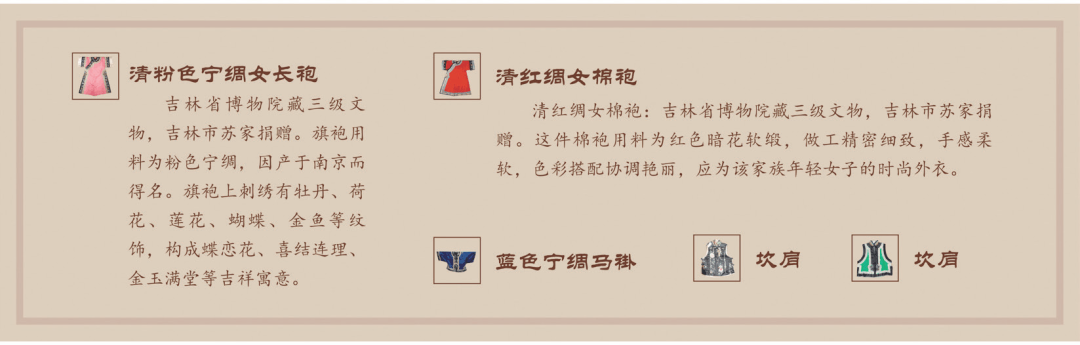 展览第一部分介绍了满族的历史沿革和满族民间刺绣的起源发展等相关知识。在历代史籍中,满族先民曾先后被称为“肃慎”“挹娄”“勿吉”“靺鞨”“女真”等,1635年,皇太极改“女真”族名为“满洲”,辛亥革命后,改称为满族,沿用至今。关于满族民间刺绣,相关的史籍记载不是很多,需要从各种资料中抽丝剥茧,分析得出。