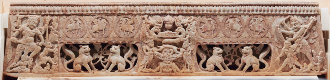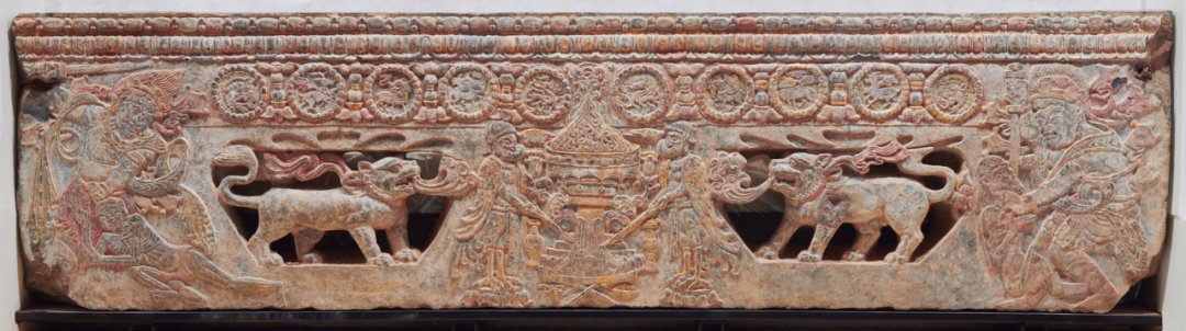 石床前档(图4)是2023年5月初美国纽约曼哈顿区检察官办公室向我国返还的非法流失的重要石刻文物。围屏石榻是北朝至隋唐时期流行于中国北方地区的殓葬用具,“石床前档”为围屏石榻的前档板。石床前档是典型的琐罗亚斯德教(又名祆教、拜火教等)文化产物,有拜火坛、穆护守坛、天王护卫等图案,其标志性图像为大祭司、护法神祇及神异动物。