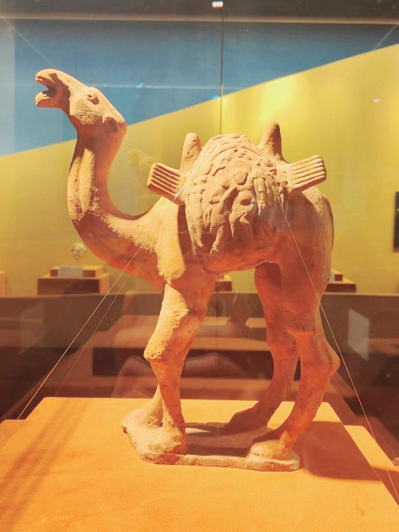 集中西方文明交流互鉴印迹于一器的展品,如 “醉拂菻”希腊酒神驼囊俑、西藏阿里地区古象雄国 墓葬出土的金面具、赫连山墓墓室东壁壁画等可以淋 漓尽致地体现“各美其美,美美与共”,来自不同国 家的展品同台展示,亦可充分阐释这一理念。策展团 队原计划是将各个参展国家的展品打散,交叉融合展 示,而非像现在以国家为单元展示,遗憾的是因为时 间紧迫,从展品到展陈形式都没有达到预期,但是细 心的观众应可从现有展品中发现一些端倪。