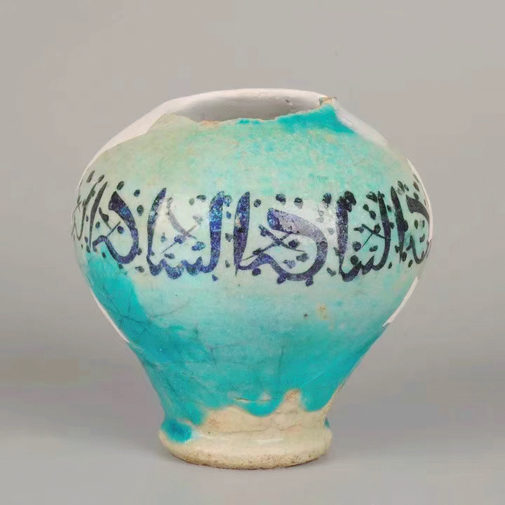这件釉陶器器体内外均施有青蓝色釉,釉料中添加珠光,上腹以钴蓝色颜料绘制文字及点状装饰,书写文字初步判断为叙利亚文或古波斯文,推测其用途可能是宗教活动中盛装某种液体的特殊容器。