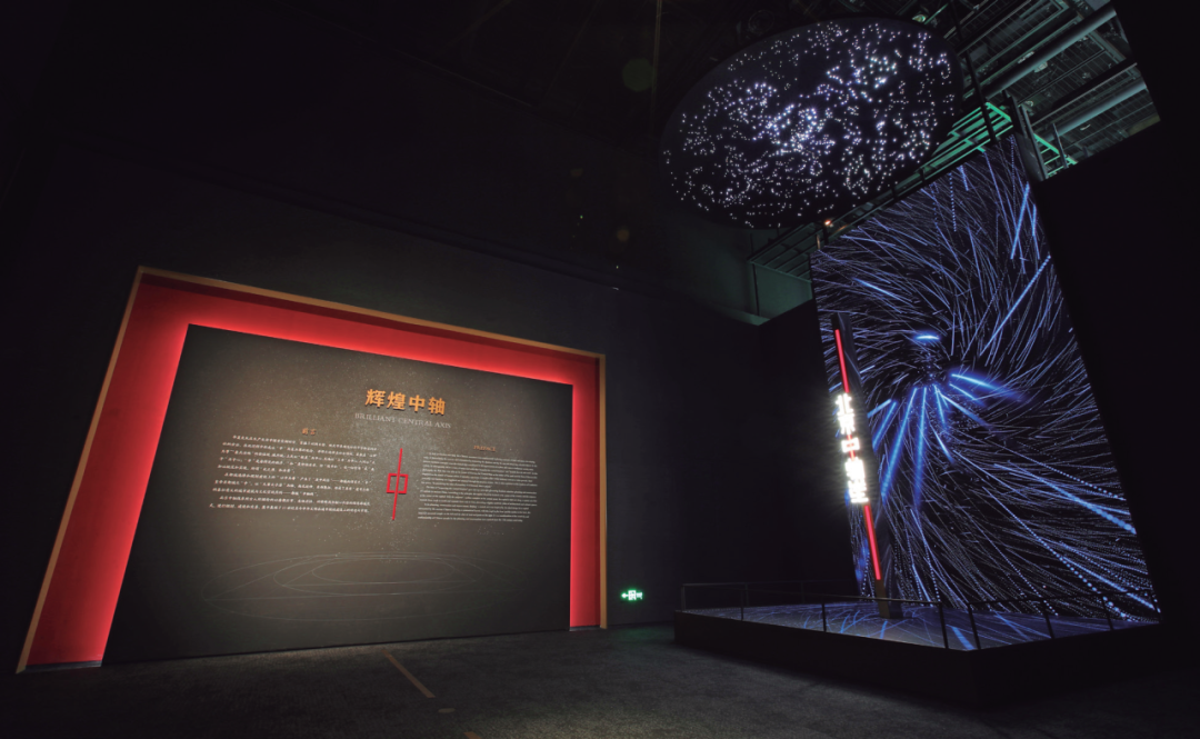其一,充分运用数字化展示手段,制作多个沉浸式演绎展项。一是展现中字意象,将展名设为“立表”,置于序厅中央,星空穹顶下的巨幕结合地屏演绎“中”字形变及由分散至中轴的变化过程(图4);二是制作16米长“北京中轴线”原木模型数字沙盘,通过立体投影艺术展现北京中轴线象天法地建造历程,与端头6米高LED拼屏共同演绎画中的燕山远景及北京四季昼夜变化;三是动态展现八大作工艺,以中和殿为例,以多画屏为载体,艺术创作八大作工序原理动画,生动再现精湛技艺;四是以《四库全书》为始,动态模拟《雍正帝祭先农坛图》卷,结合真人拍摄演绎祭祀乐舞景象,生动还原祭祀礼仪中的情境状态;五是重绘《周礼·考工记》与元大都,从北斗至周礼再到刘秉忠规划元大都,以电子立体书的形式将专业知识动态演绎;六是“我在中轴线上”即时互动展项。观众通过打卡拍照、沉浸式游历数字中轴线。七是展厅中整套文物说明系统采用数字电子屏,为展出过程中结合主题活动实时增加拓展信息提供便捷。