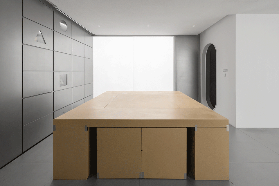 预制化设计为新的空间模式提供了可能性。在这个项目中,我们将灯光、电路等工序全部集成于产品陈列装置内,通过工厂加工完成。现场施工仅为升降系统的受力结构和陈列装置的安装。通过预设程序,我们定义了两种不同的升降模式,从而满足了不同功能的需求,同时增加了与客户的互动性。