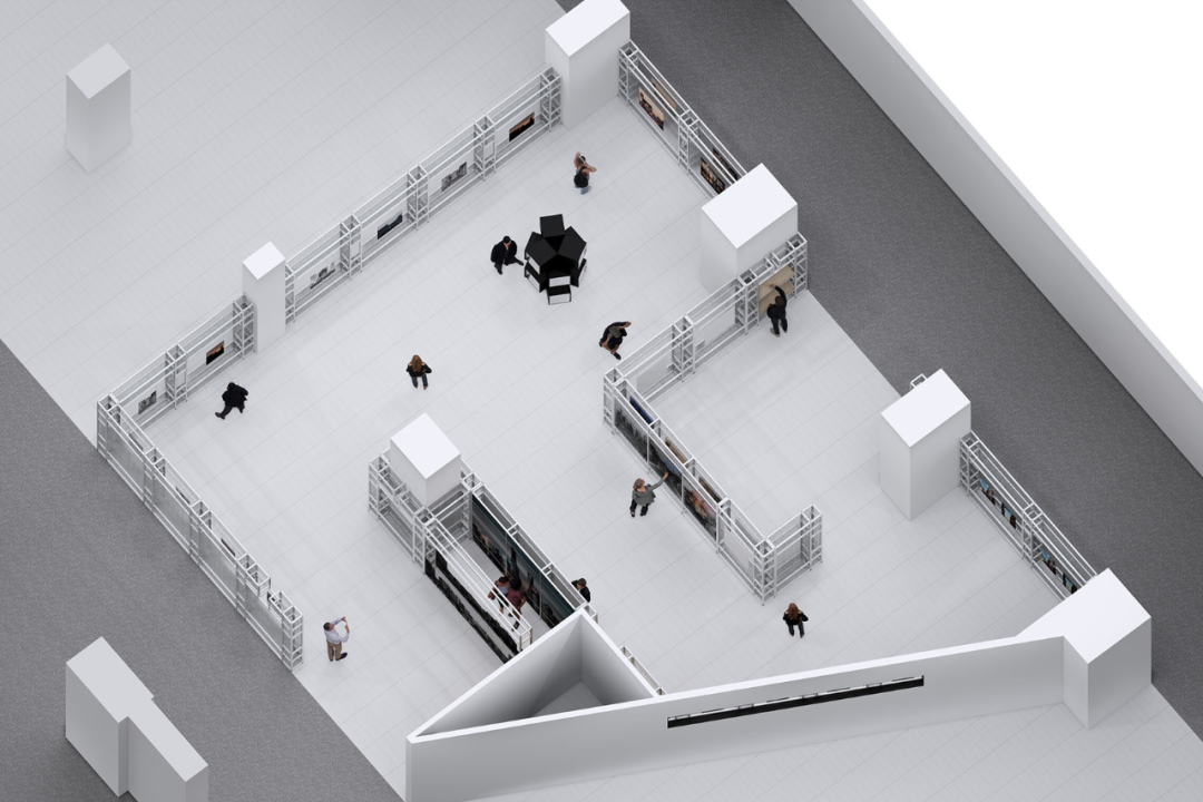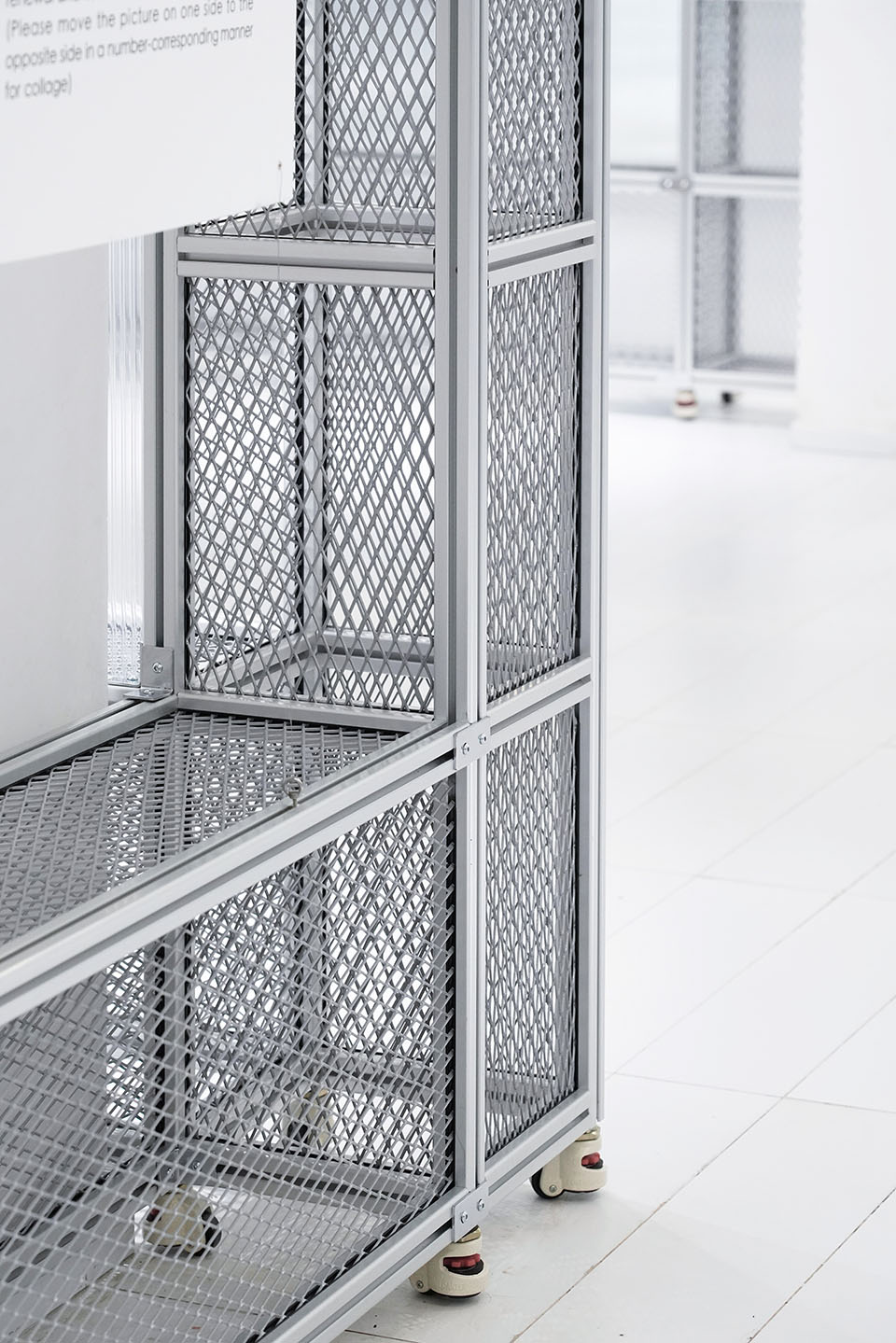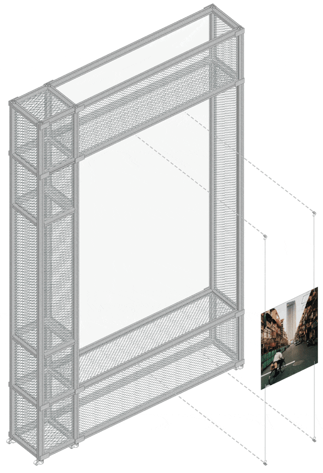 In order to correspond with the exhibition theme of urban renewal and considering the need to convert exhibition space into office space in the later stage, we propose a design strategy of "dismantling and reshaping". We choose industrial aluminum profiles as the basic building material, which is easy to assemble and can be stacked with different materials to adapt to different curatorial content. After installing the Fuma Wheel at the bottom, the exhibition space can still move flexibly, increasing the flexibility of use, and the boundaries of the space are also easier to change and expand. This design scheme can meet the needs of the exhibition and provide convenience for the later conversion of office space.