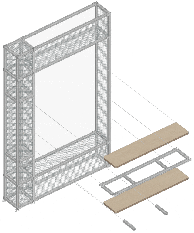 铝型材所搭建的框架,在安装了船型螺帽和吊环之后即可演变成挂画框架。展览结束后,只需拆卸挂画的构件,根据需求增加铝型材龙骨,再叠加层板,便可成为置物框架。这种设计方案方便快捷,能够在展览结束后迅速转换空间功能,充分利用了铝型材的灵活性和可塑性。