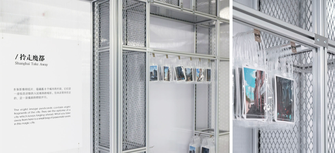 在展览的尾声,我们设置了礼品区“拎走魔都”,礼品袋中装有几张上海的城市更新影像。这些影像是城市发展的几个典型切片,我们希望观众在拎走这几个瞬间的同时,也能够通过本次展览,让心目中这座蓬勃奋进的城市更加鲜活和可爱。这样的设计不仅能够给观众留下深刻的印象,也为他们带来了一份珍贵的礼物,使展览的意义延续在观众的日常生活中。