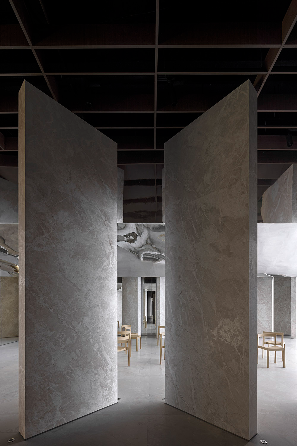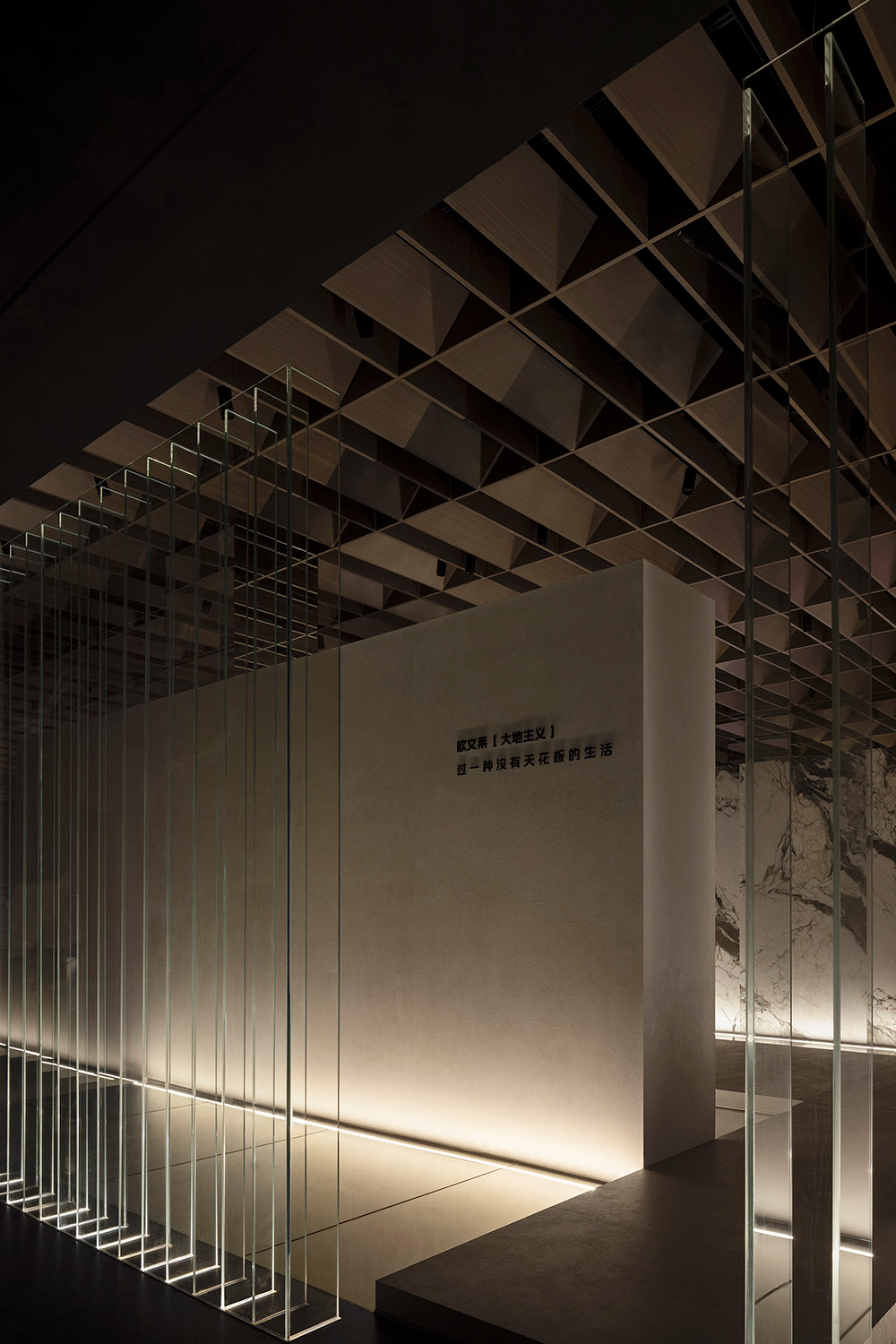 The overall design logic of a space is a showcase for a product, where people and objects interact, showcasing the relationship between people and space, as well as products. The design is centered around rock slabs and wooden ceiling structures to enhance the natural and gentle nature of the space.