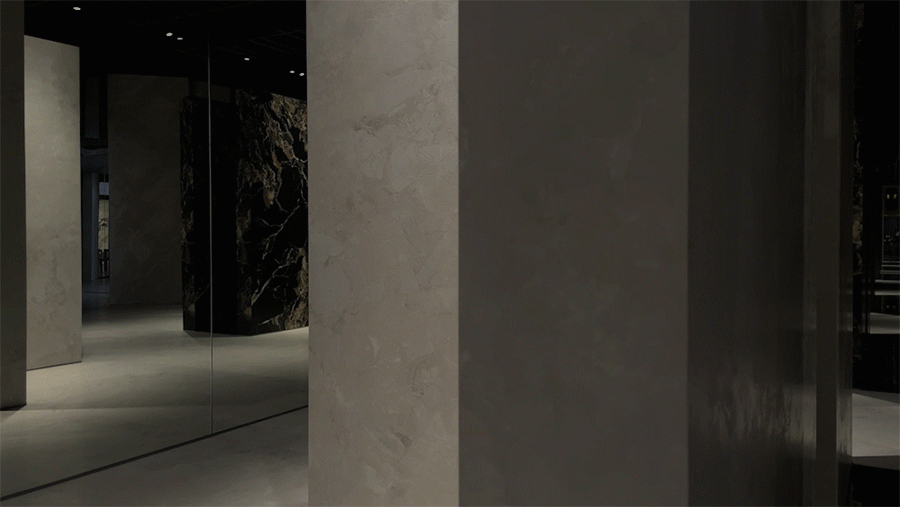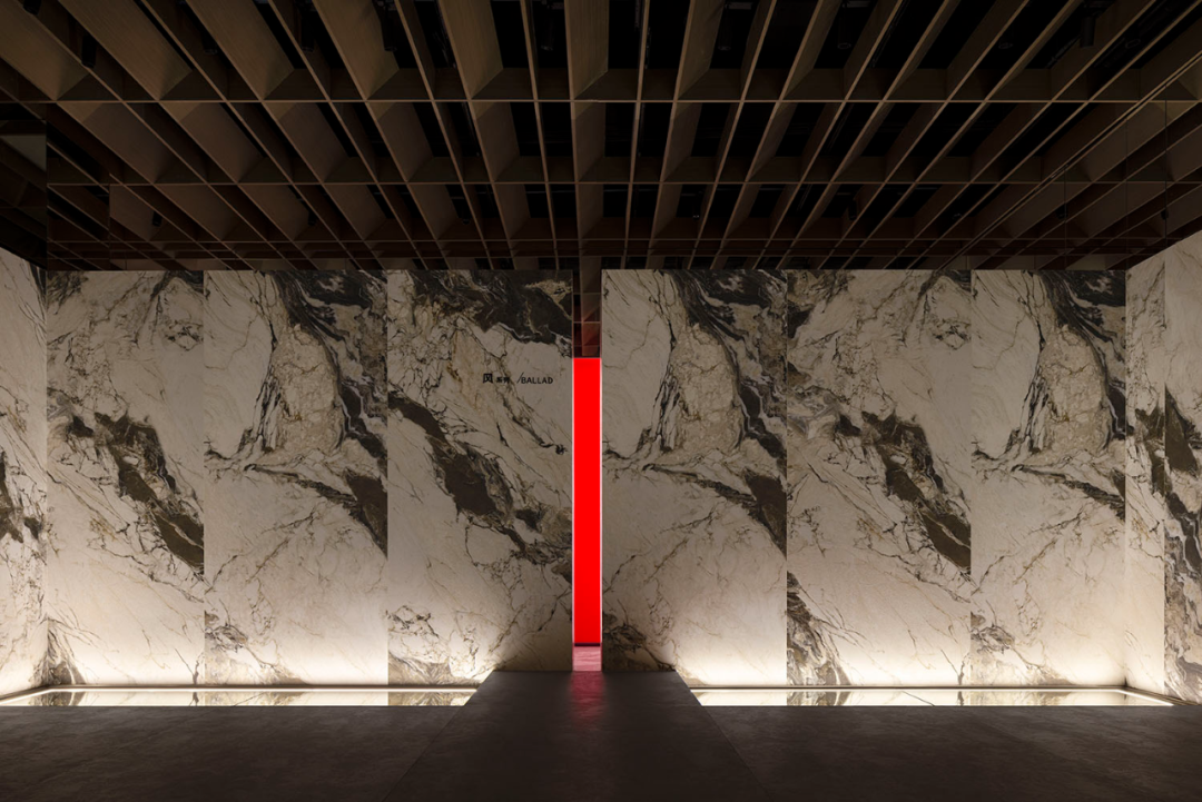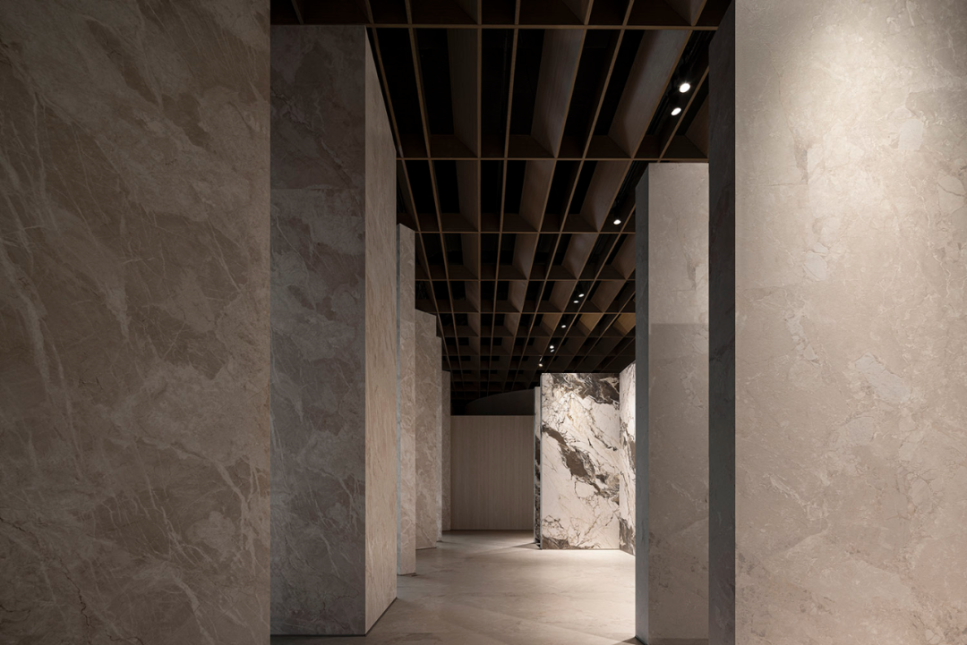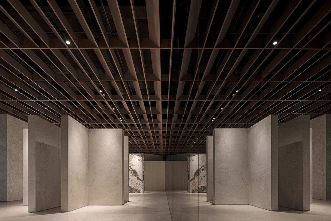空间整体设计逻辑,是一个产品的秀场,化人为物,人与物互动,展示人与空间、与产品的关系,整体以岩板为核心,木质天花结构来提升空间自然与温和的设计目的。
