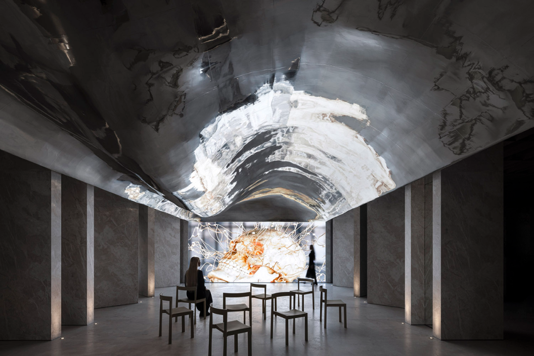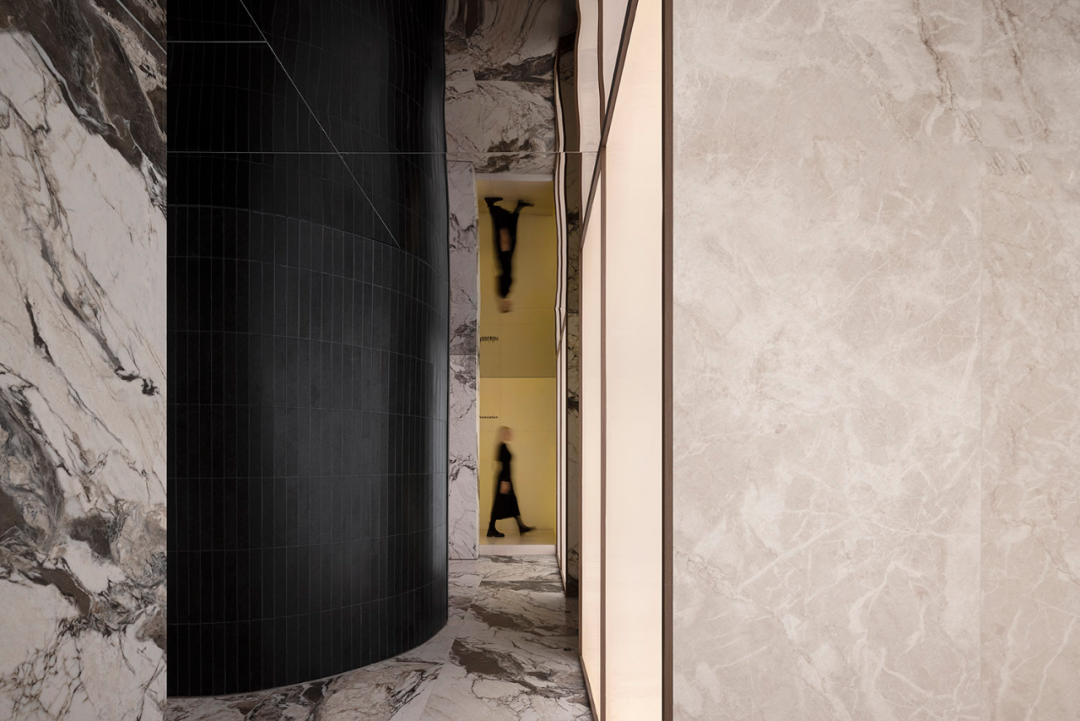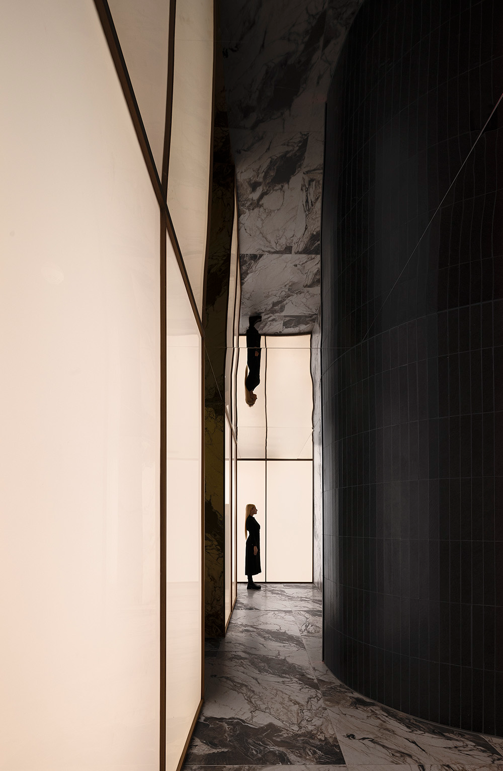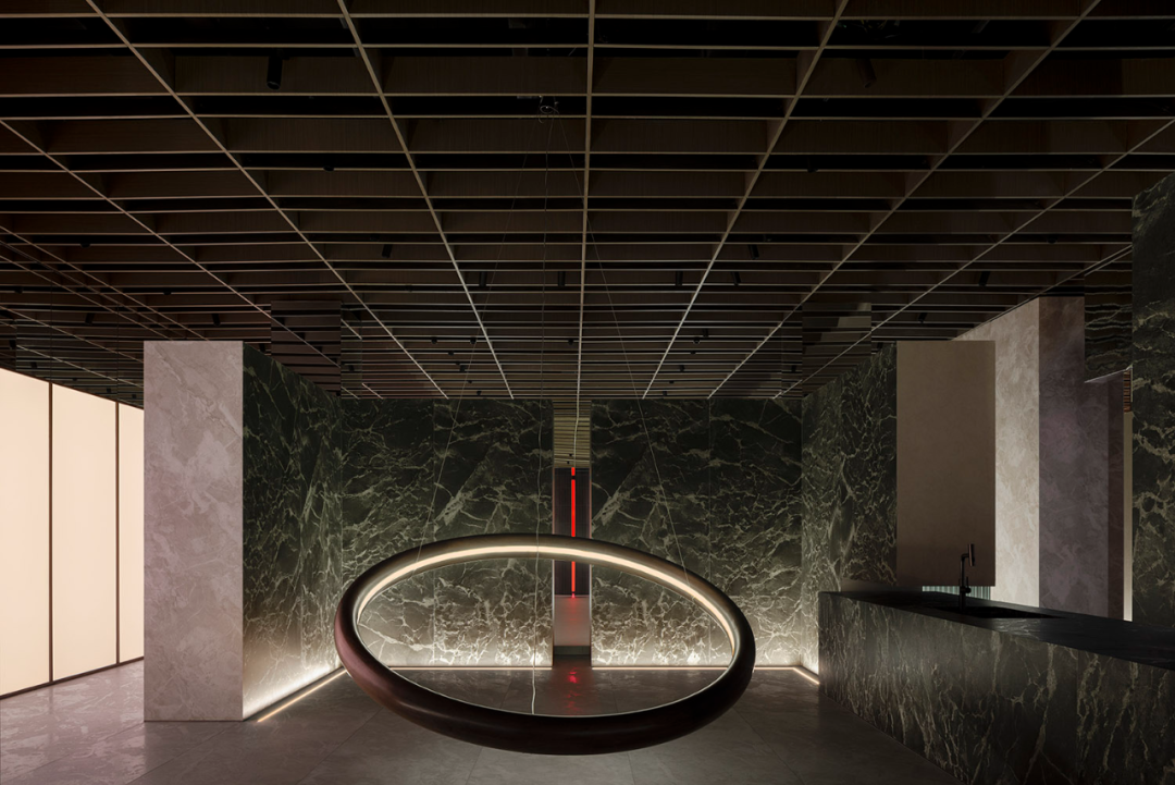 The enclosed space with green marble pattern is not only a display area for the product, but also a supporting water bar for the salon. It emphasizes the visual sense in the experience while also emphasizing the integration of functionality. At the same time, the futuristic spatial sense and feeling are another core of the design.