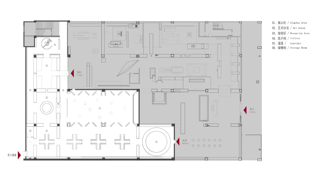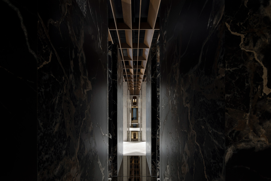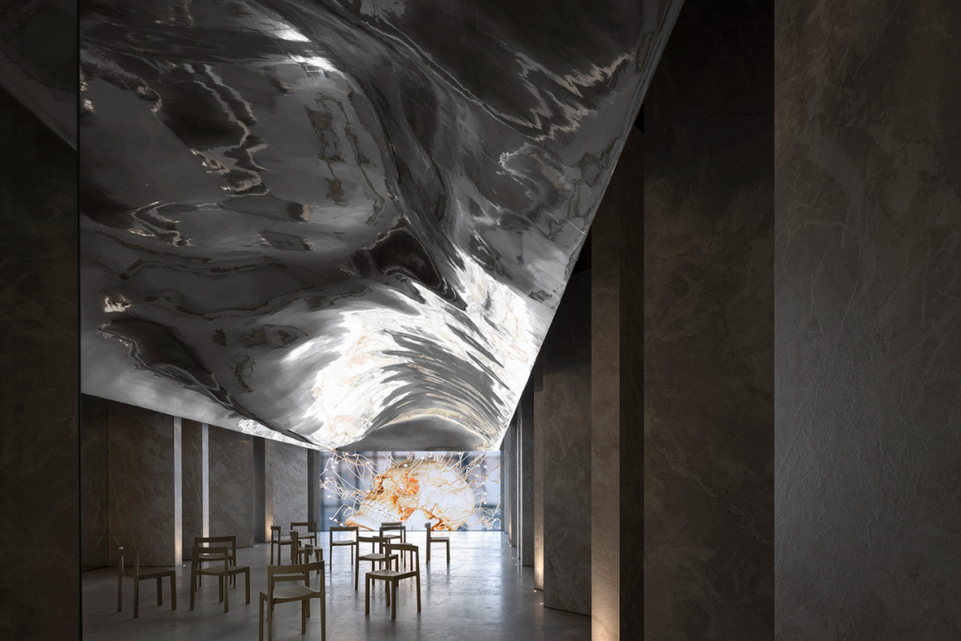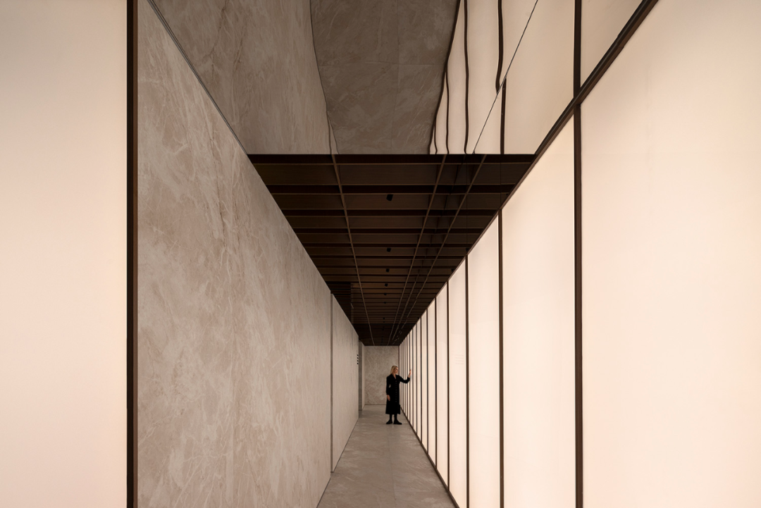 The space area of the original building that has not been renovated is separated by an array of glass and enclosed by four L-shaped thick walls to form the first product display space; The reception and rest area is connected by the brand space closest to the entrance, and the mirror on the ground has a water like atmosphere, effectively softening the hardness of the space while causing the connection of the space to break. The enclosed space showcases the Ou Brunei Land themed product series' Wind ', with clean surrounding products effectively highlighting the natural and unrestrained characteristics of the product's' Wind'. The cross shaped ground creates an extreme sense of balance in the space, with large openings guiding visitors towards the corridor.