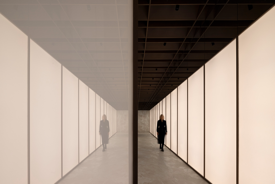 原建筑未改造的空间区域,用阵列的玻璃作为隔断,四片L型的厚墙围合形成了第一个产品的运用展示空间;接待休息区由入口处最近的品牌空间相链接,地面的镜面有水的意境,有效地柔化了空间的硬度,同时让空间的链接产生了断裂。围合的空间展示了欧文莱大地主义主题产品系列“风”,周围干净的产品有效地突出产品“风”自然不羁的特点。十字型的地面让空间产生了极度的平衡感,大的开口引导体验者通向廊道。