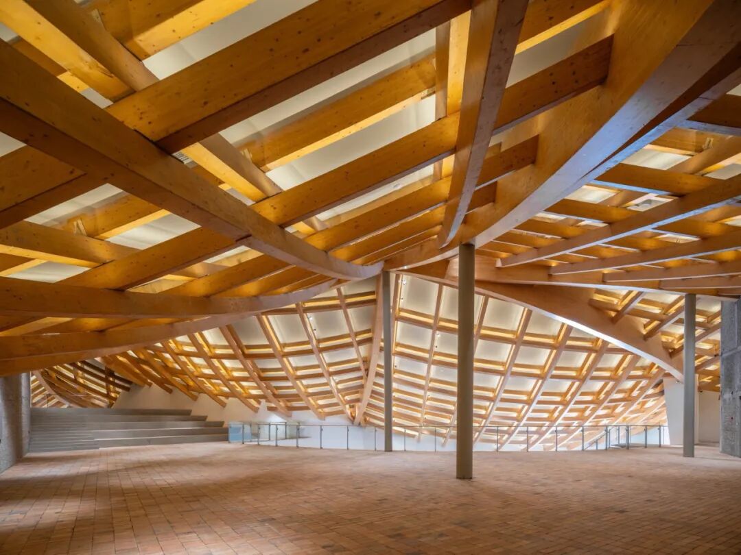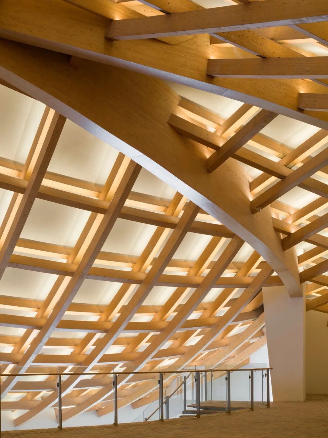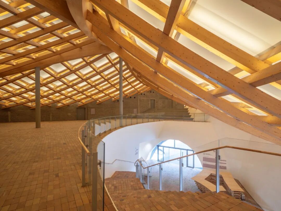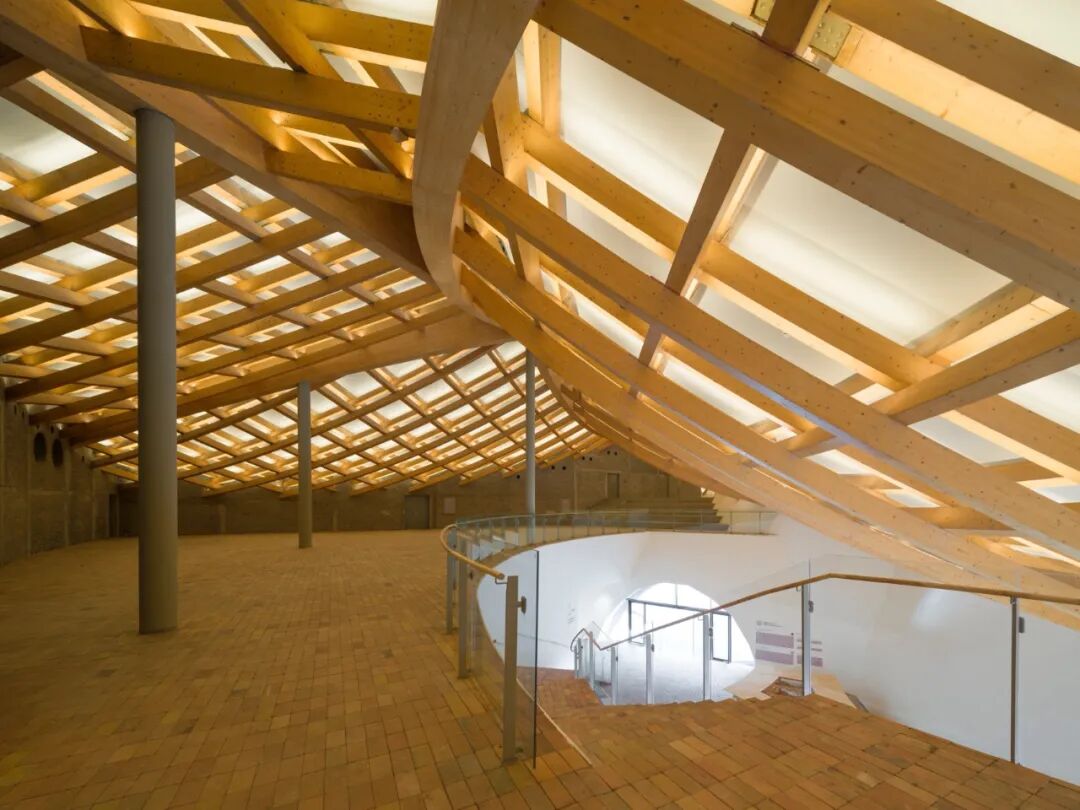 建筑体量仿若陶山,设计灵感来源于项目附近的蜀山,蜀山深受北宋作家苏东坡的喜爱,同时设计也借鉴了已有600年历史的爬坡窑炉 —— 龙窑。山状的体量设有一系列开口,以连接陶瓷工厂和运河,将建筑与场地轴线以及周围的工厂群无缝融合。屋顶采用了倒置壳体结构,由虚拟球体塑造而成,并通过四层木质格栅梁支撑。这种轻巧而坚固的木结构为室内空间带来了动态变化,引导视线和流线深入建筑内部。