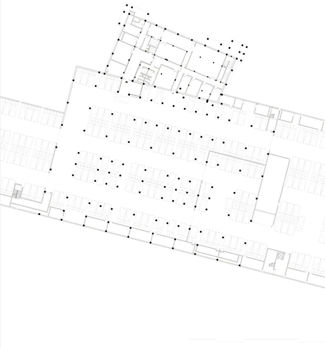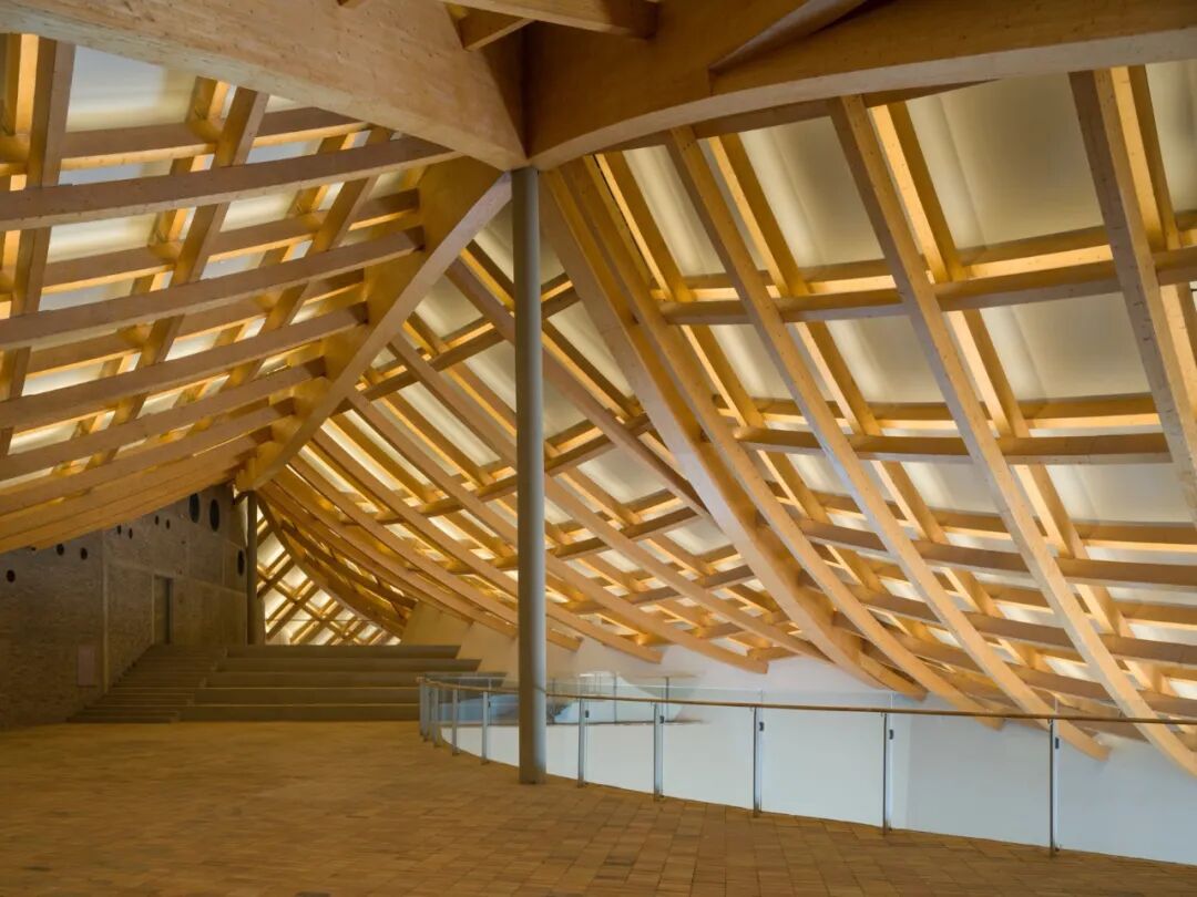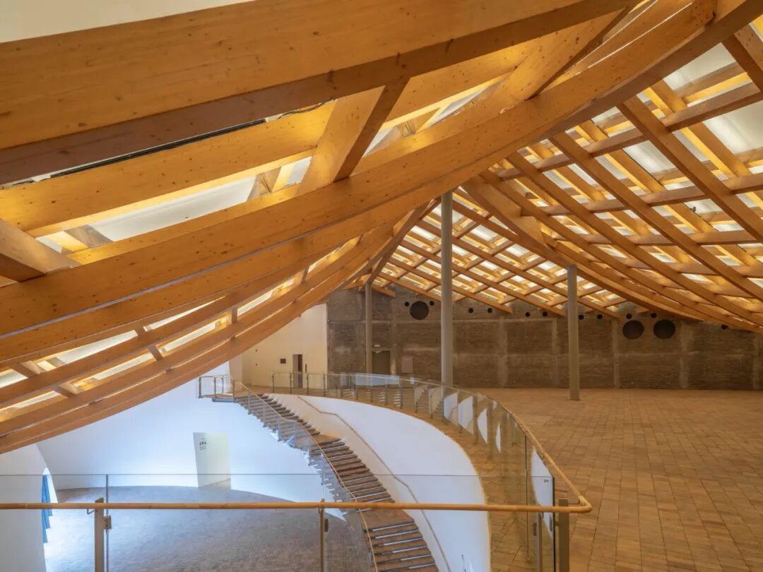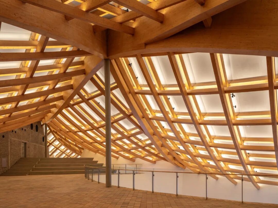 建筑体量仿若陶山,设计灵感来源于项目附近的蜀山,蜀山深受北宋作家苏东坡的喜爱,同时设计也借鉴了已有600年历史的爬坡窑炉 —— 龙窑。山状的体量设有一系列开口,以连接陶瓷工厂和运河,将建筑与场地轴线以及周围的工厂群无缝融合。屋顶采用了倒置壳体结构,由虚拟球体塑造而成,并通过四层木质格栅梁支撑。这种轻巧而坚固的木结构为室内空间带来了动态变化,引导视线和流线深入建筑内部。
