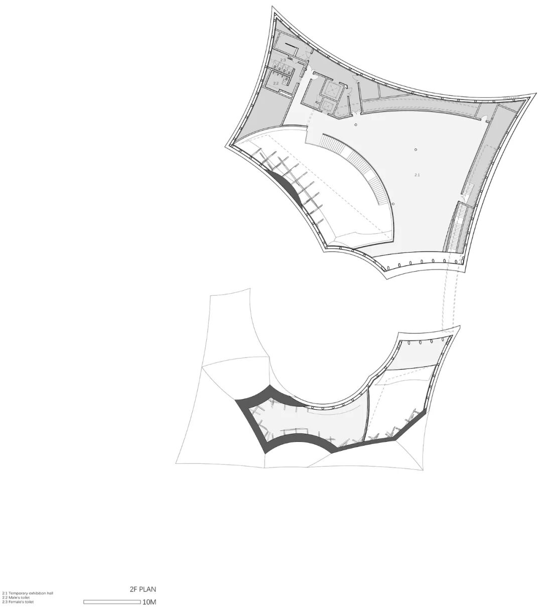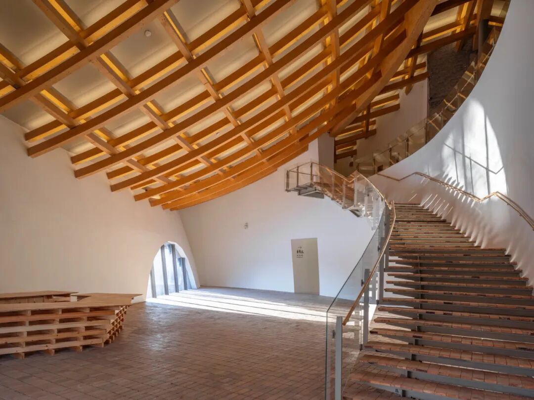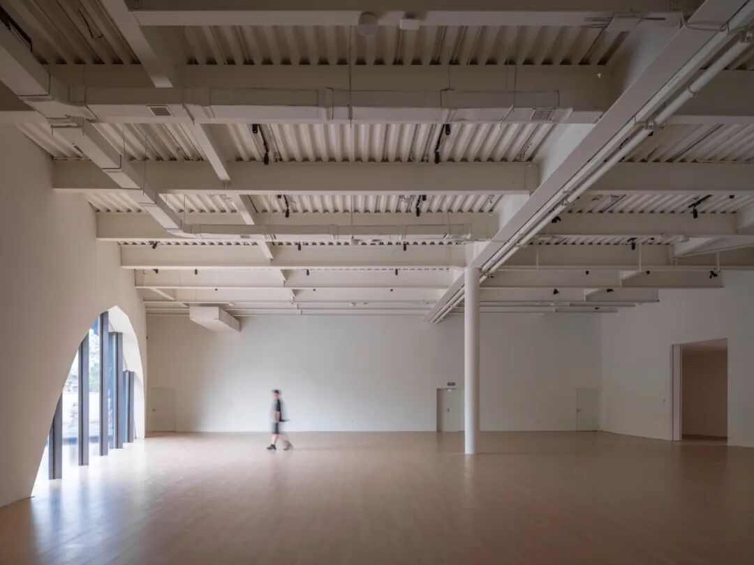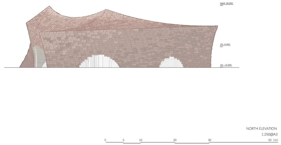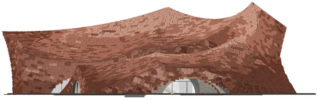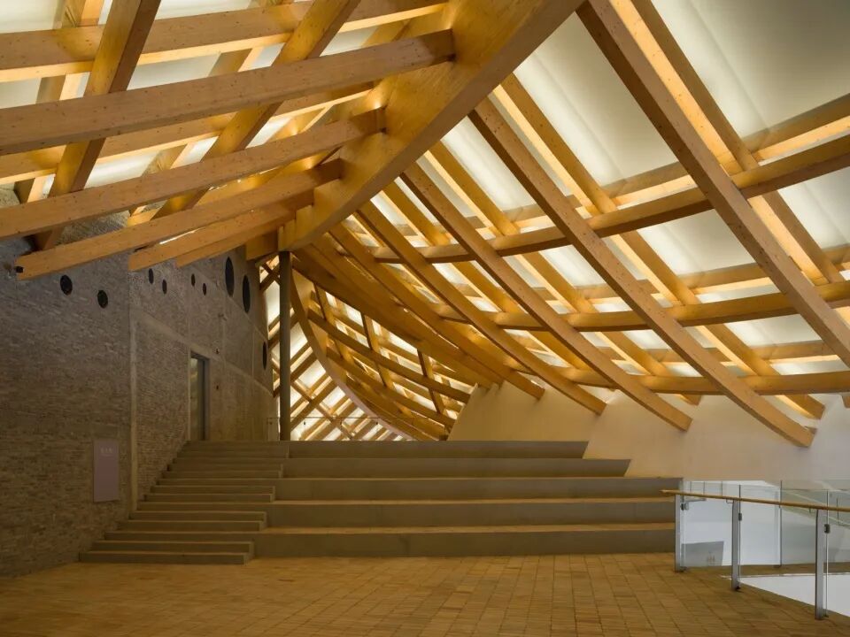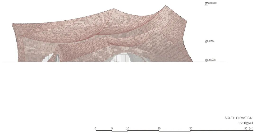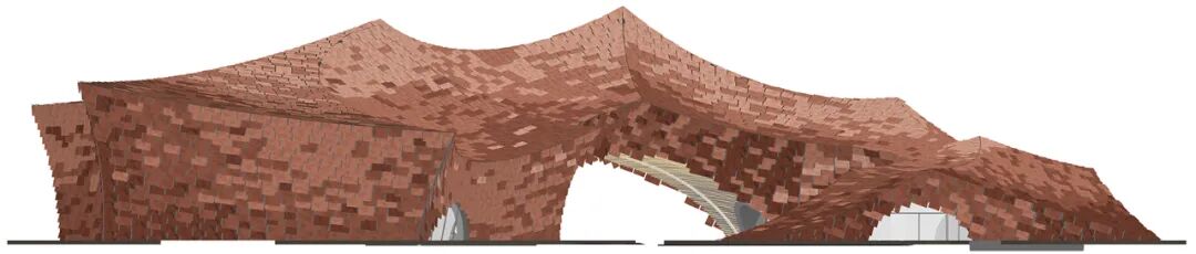 The architectural volume resembles that of Taoshan, and the design inspiration comes from the nearby Shu Mountain. Shu Mountain was deeply loved by the Northern Song writer Su Dongpo, and the design also drew inspiration from the 600 year old climbing kiln - Dragon Kiln. The mountain shaped volume features a series of openings to connect ceramic factories and canals, seamlessly integrating the building with the site axis and surrounding factory clusters. The roof adopts an inverted shell structure, shaped by virtual spheres, and supported by four layers of wooden grid beams. This lightweight and sturdy wooden structure brings dynamic changes to the indoor space, guiding the line of sight and flow deep into the interior of the building.