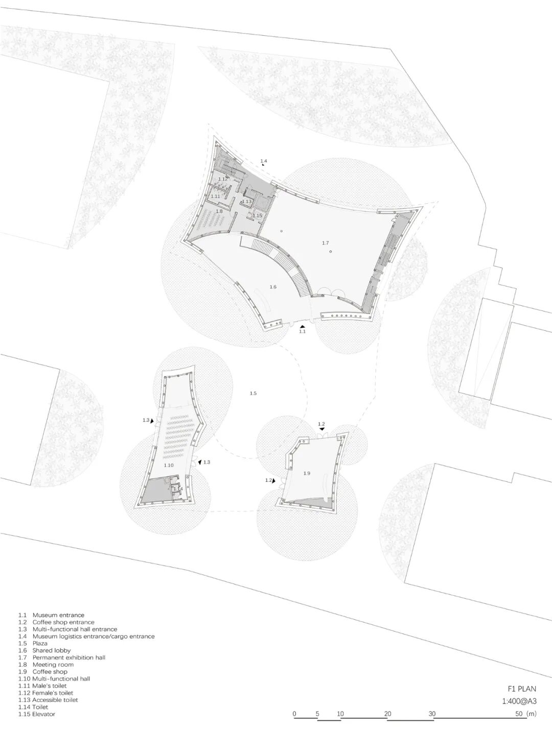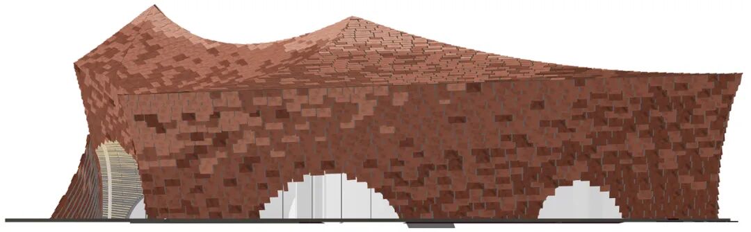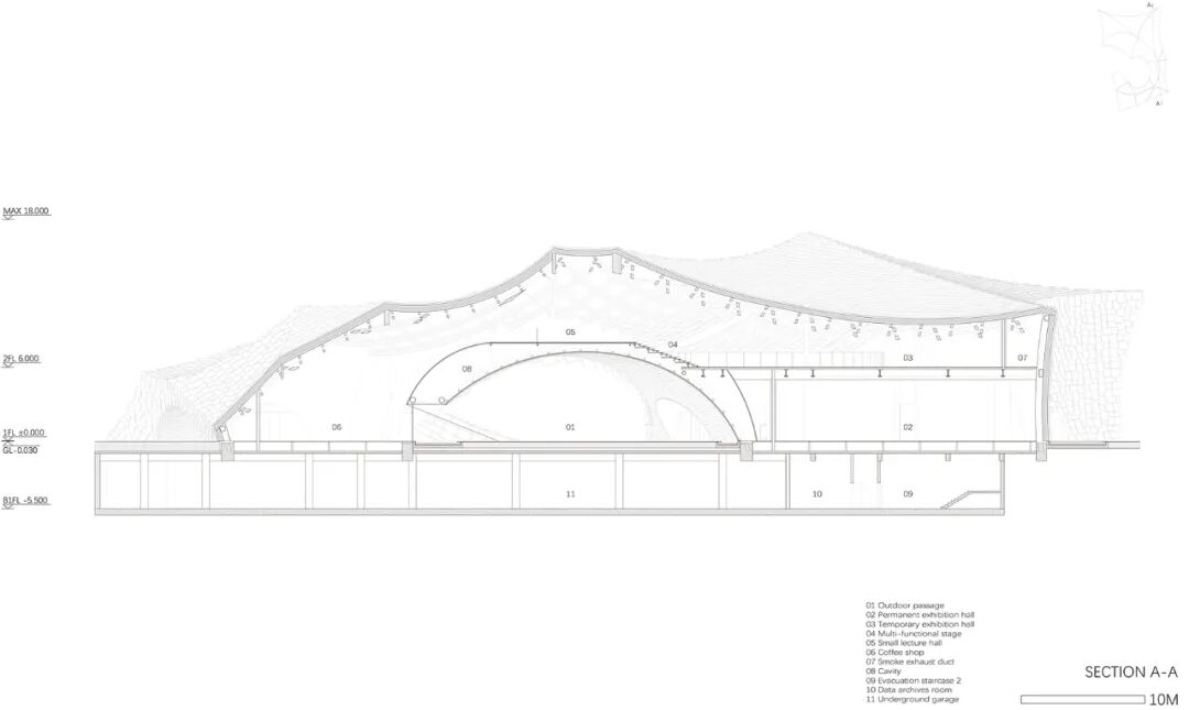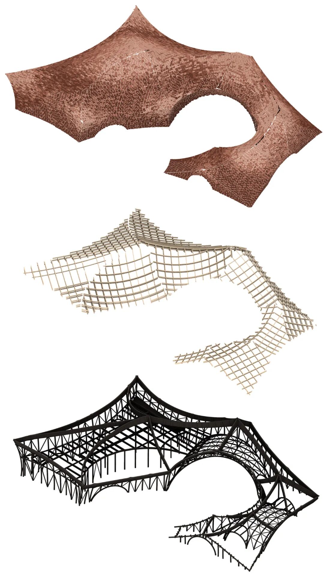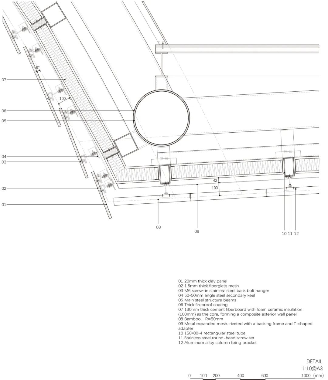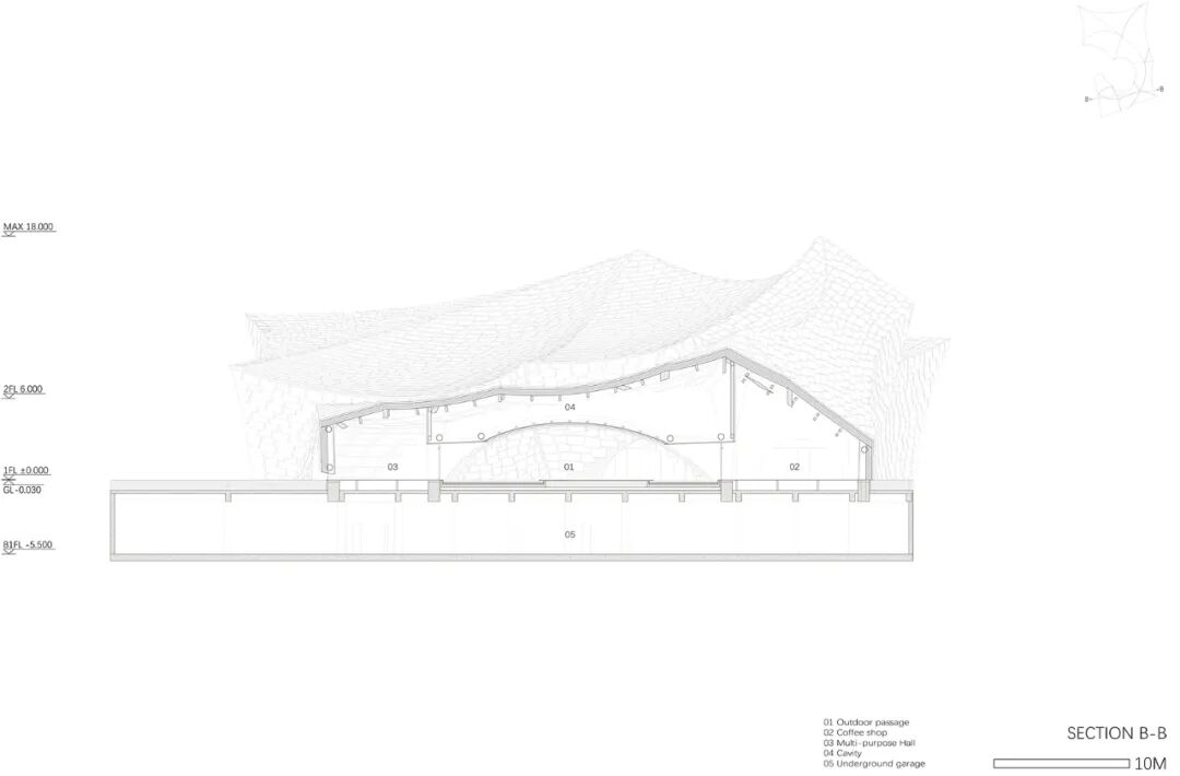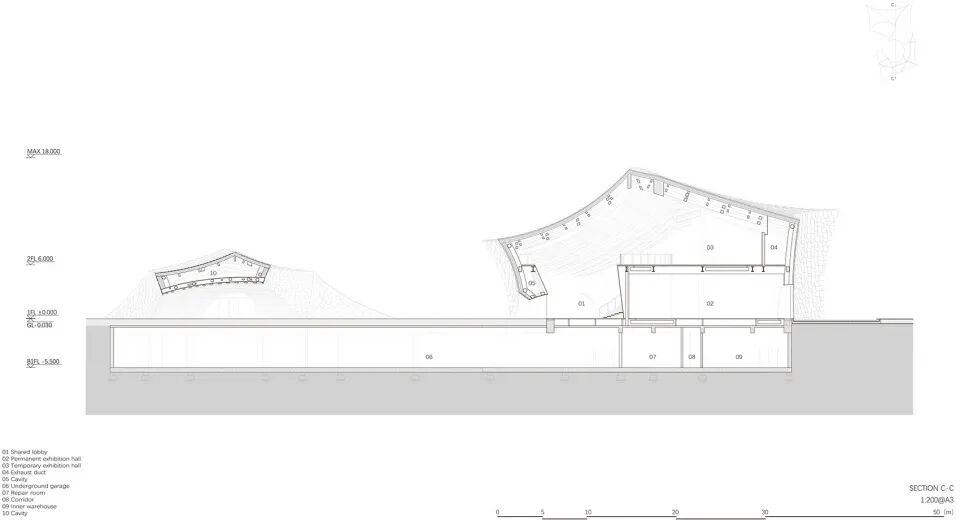 The architectural volume resembles that of Taoshan, and the design inspiration comes from the nearby Shu Mountain. Shu Mountain was deeply loved by the Northern Song writer Su Dongpo, and the design also drew inspiration from the 600 year old climbing kiln - Dragon Kiln. The mountain shaped volume features a series of openings to connect ceramic factories and canals, seamlessly integrating the building with the site axis and surrounding factory clusters. The roof adopts an inverted shell structure, shaped by virtual spheres, and supported by four layers of wooden grid beams. This lightweight and sturdy wooden structure brings dynamic changes to the indoor space, guiding the line of sight and flow deep into the interior of the building.