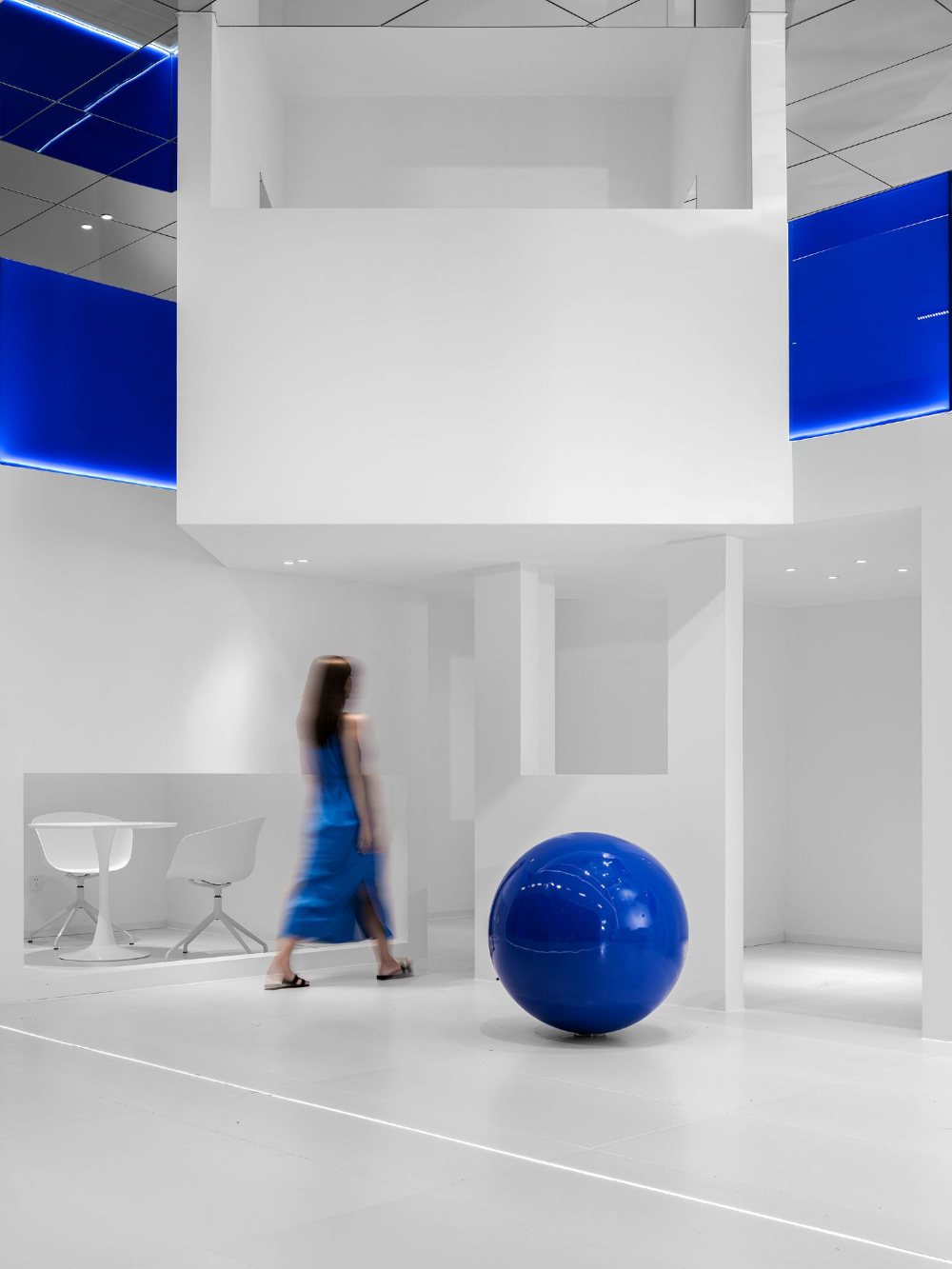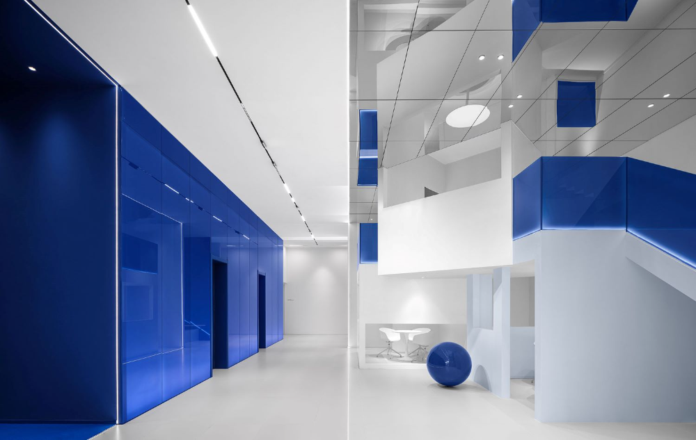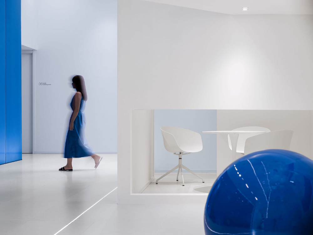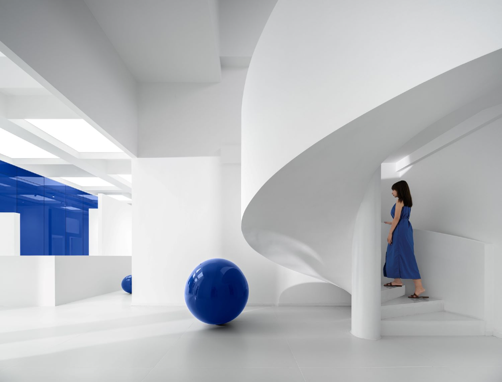 To get the ideal blue color on different materials, the color matching process went through many twists and turns. After changing more than 20 samples and when the designer was about to give up, the most ideal color appeared.The blue spherical installation, the blue stair armrest, and the blue glass curtain wall... all the blue colors are like Marc Chagall's blue full of unrestrained and infinitely flowing love.