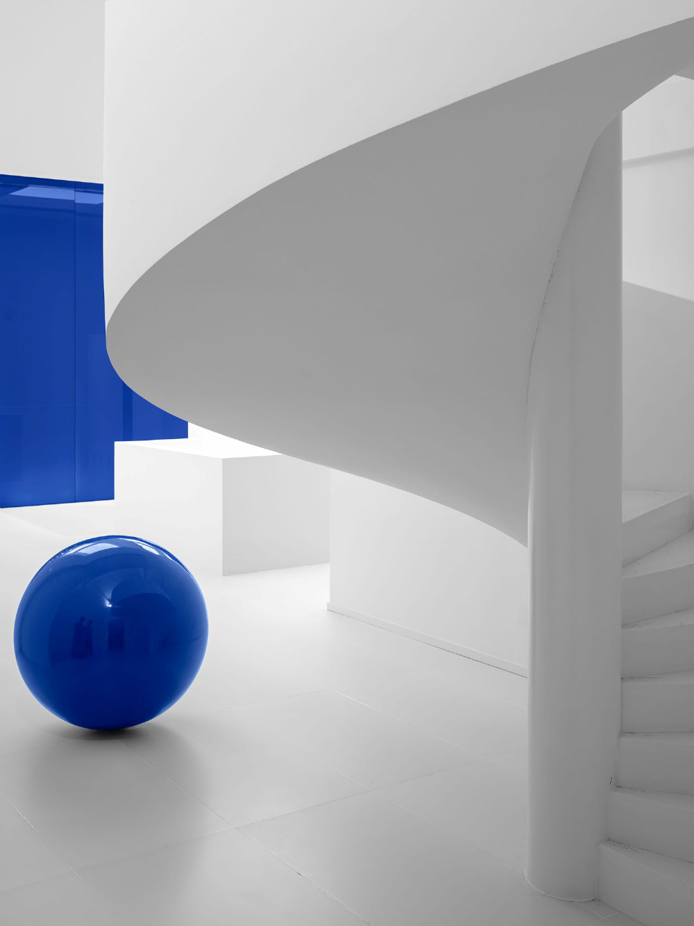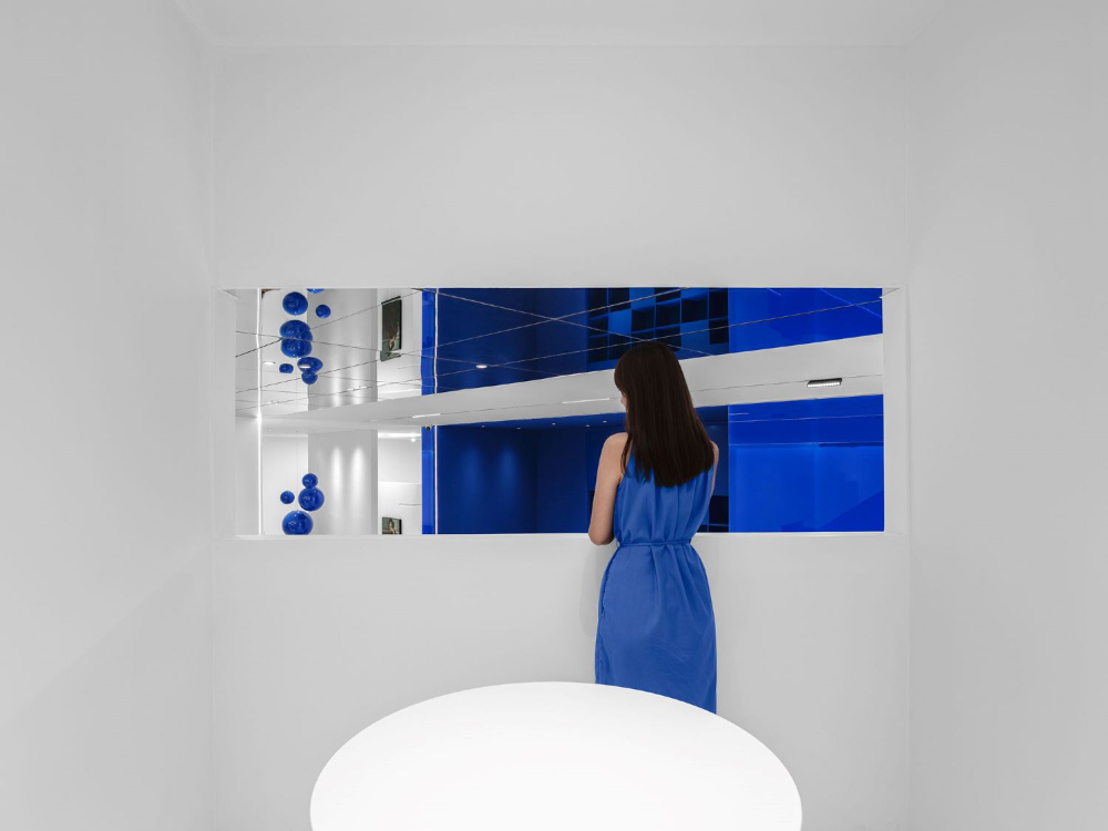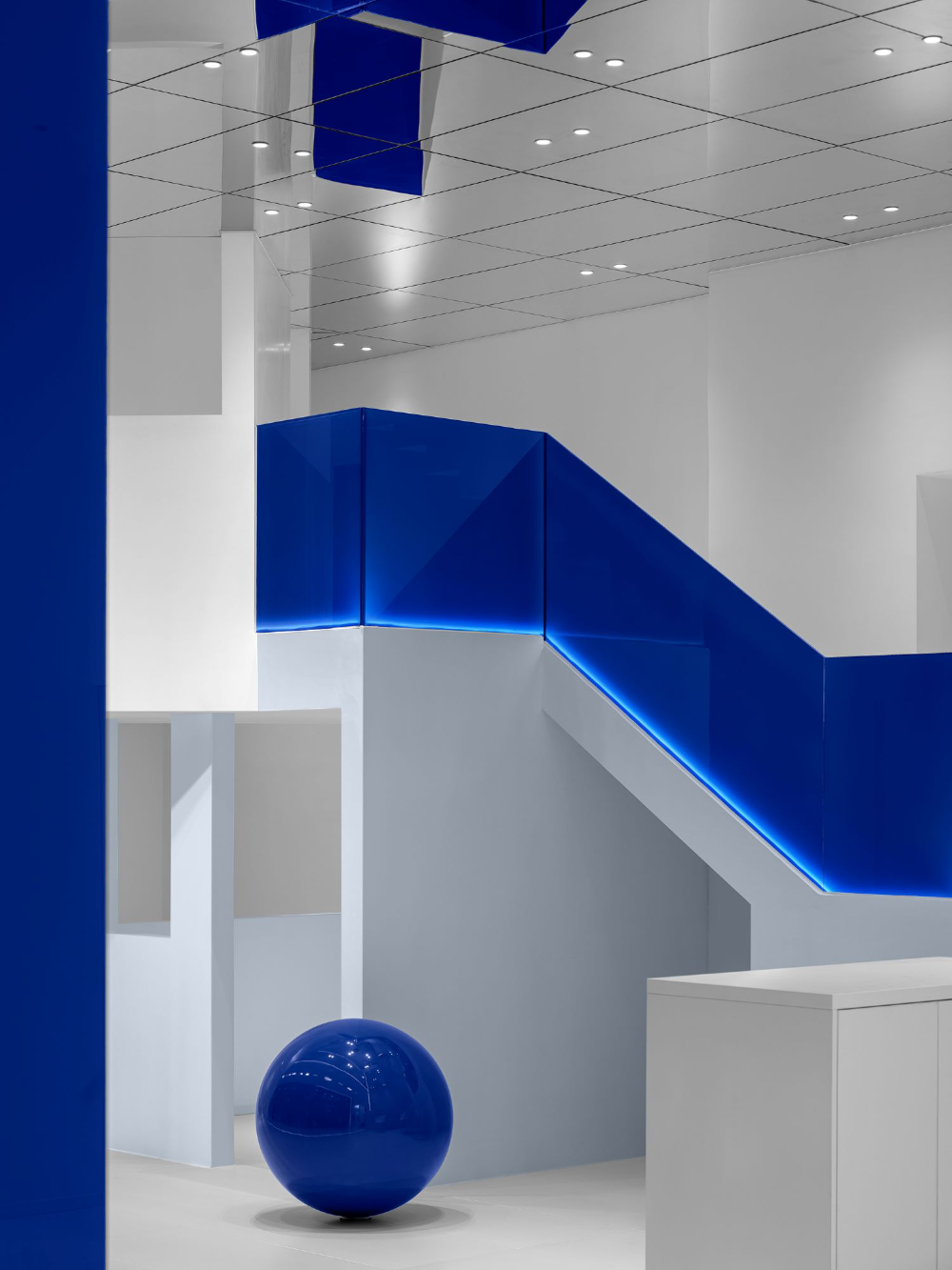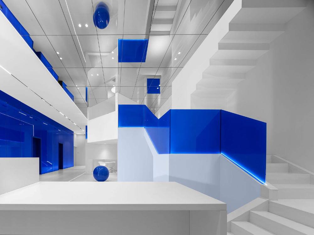 为了在不同材料上获得理想的蓝色,配色过程经历了许多曲折。在更换了20多个样品后,当设计师即将放弃时,最理想的颜色出现了。蓝色球形装置、蓝色楼梯扶手和蓝色玻璃幕墙,所有的蓝色都像Marc Chagall的蓝色,充满了奔放和无限流动的爱。