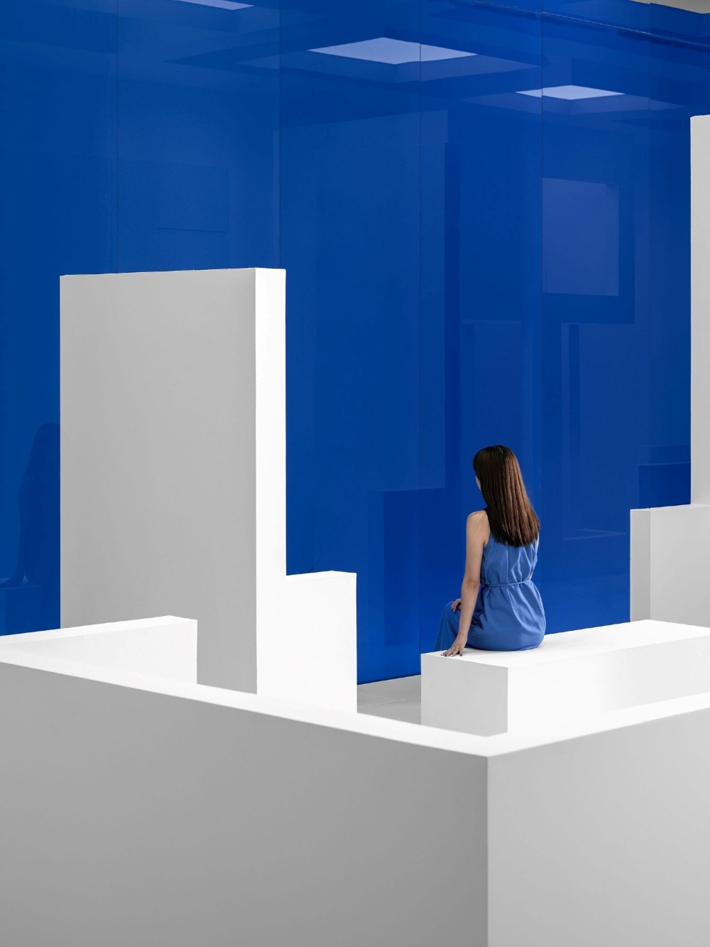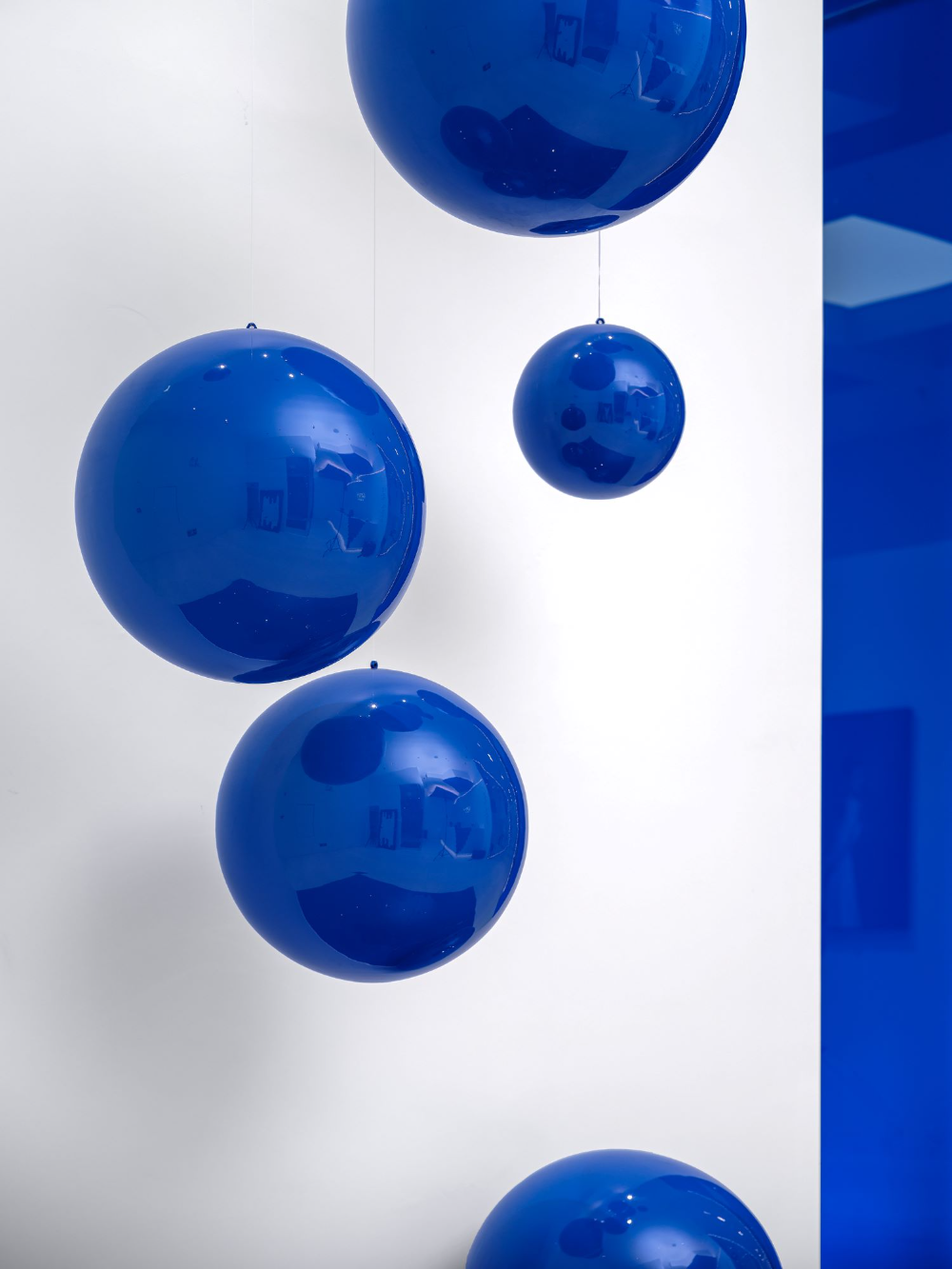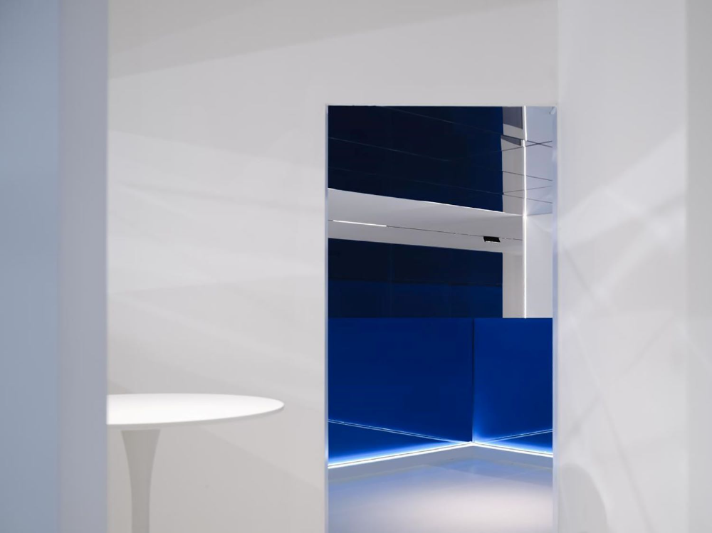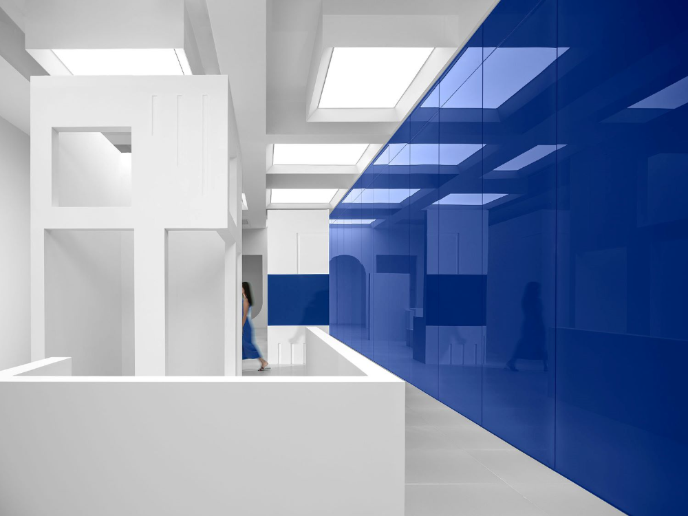 为了在不同材料上获得理想的蓝色,配色过程经历了许多曲折。在更换了20多个样品后,当设计师即将放弃时,最理想的颜色出现了。蓝色球形装置、蓝色楼梯扶手和蓝色玻璃幕墙,所有的蓝色都像Marc Chagall的蓝色,充满了奔放和无限流动的爱。