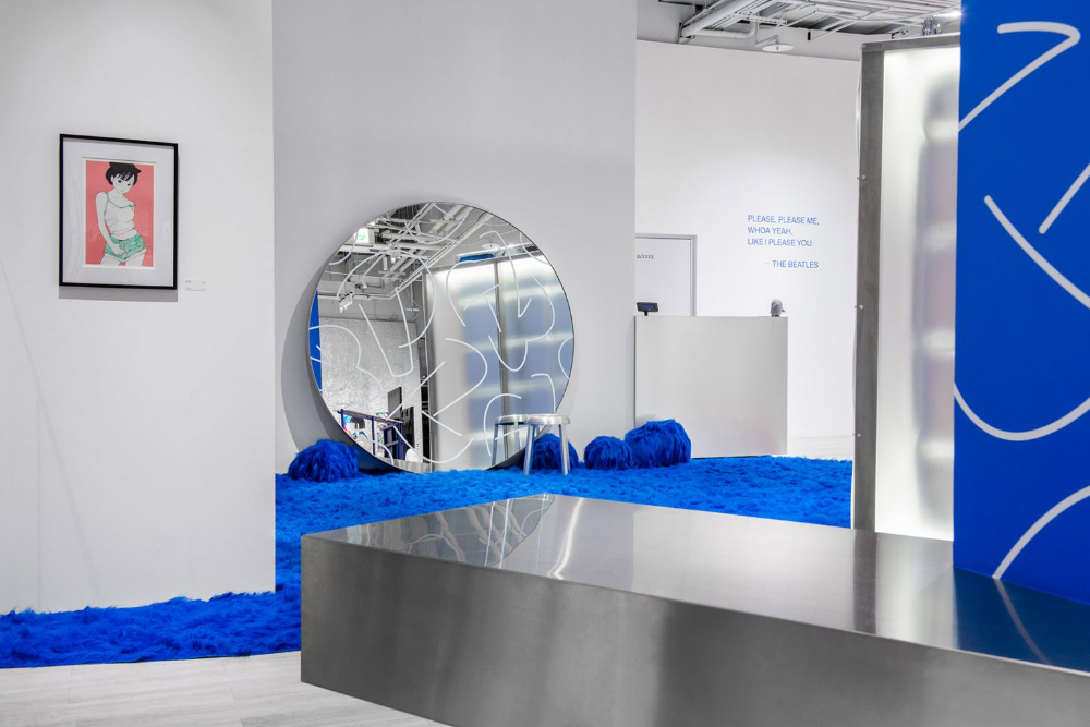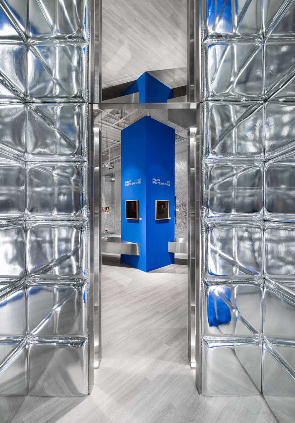 可以从多个角度切入的开放式动线,启动视觉概念上的潮汐层次,将路过的视线和脚步自然牵引至潮流艺术的流域中。展示空间以银/蓝为主。银色为背景主调,铺陈不同层次的灰阶及高光,蓝色为视觉主轴,凝聚空间整体。在此基础上变换柔软,锐利,弯曲,坚硬,皱折,平滑的质感组合,凸显个别作品的特点。