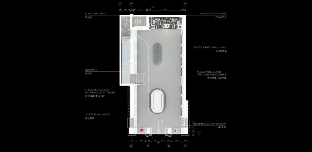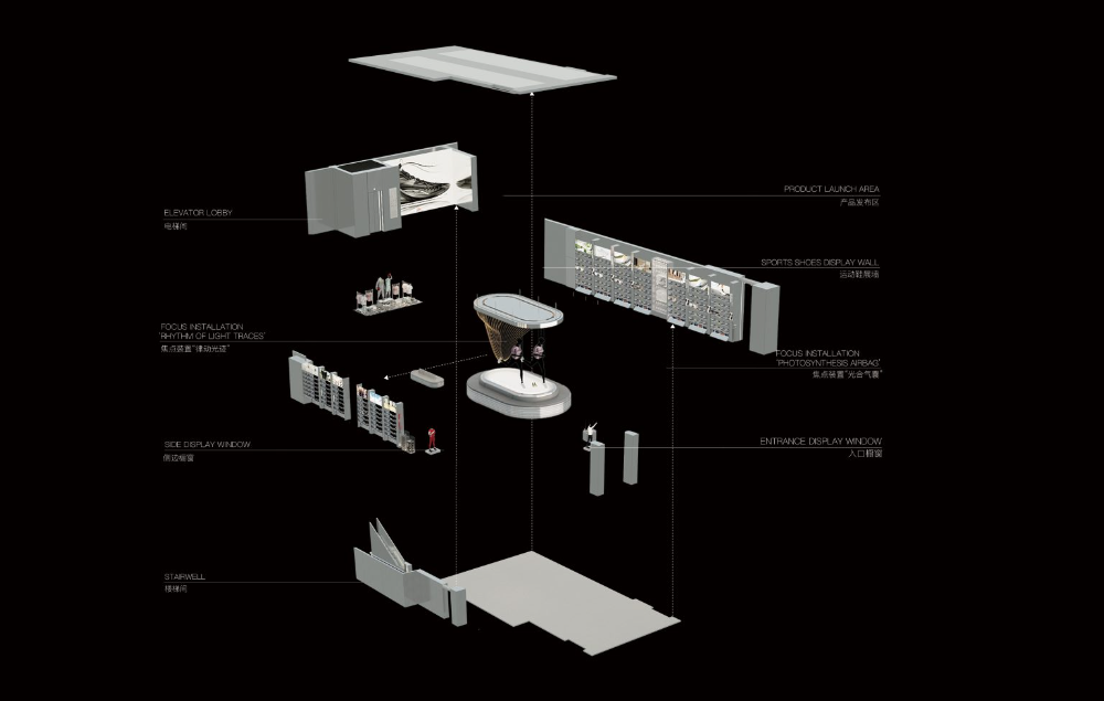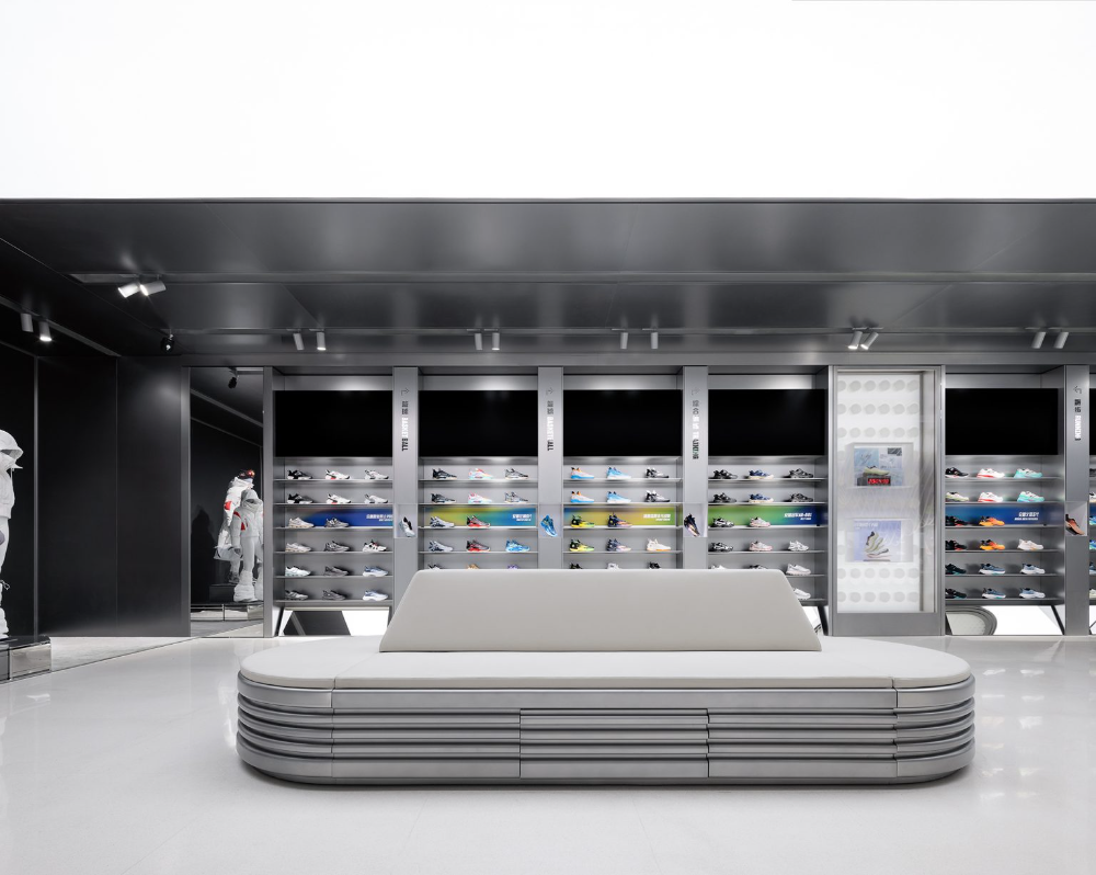 The first floor is mainly used as a display area for footwear products, inspired by laboratories and modern technology. The space mainly expresses the rhythm and technology of lines with cool metal and frosted acrylic materials. The Nakajima device simulates the transmission sensation of blood pulsation, using a design that combines pulse lights with breathing lights to present color changes in different scenes, reflecting the passion of movement. The design combines technology with sustainable sports, and all decorative elements come from ANTA's products, technology, and future, evolving into a part of architecture and interior decoration based on material form, fabric texture, and surface texture.