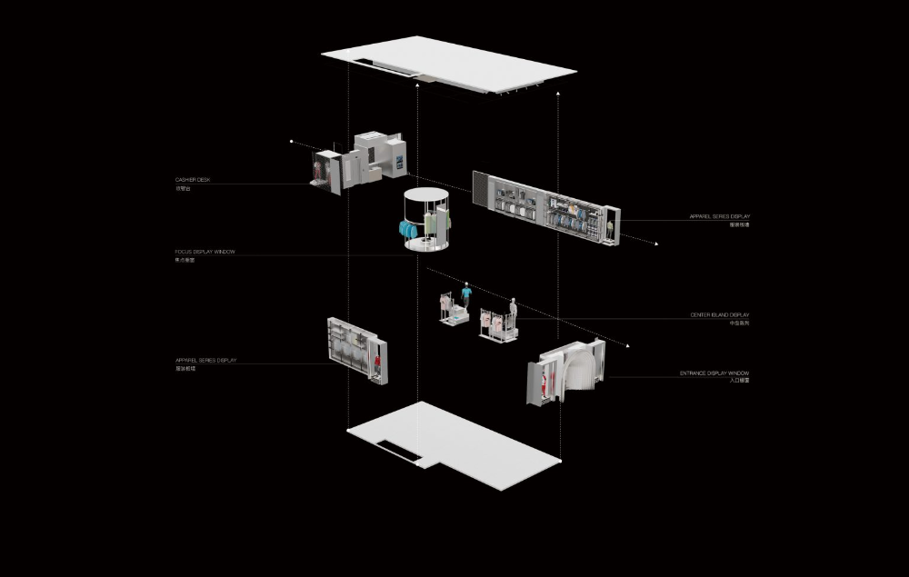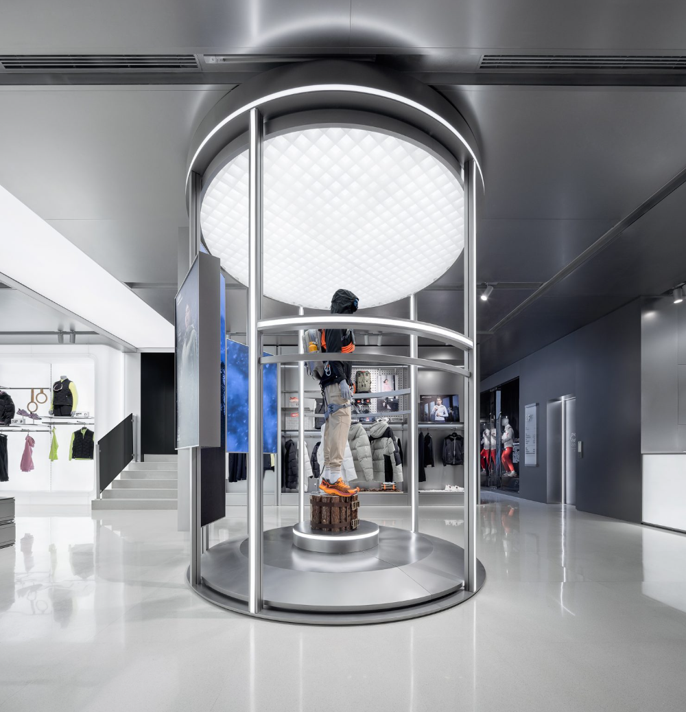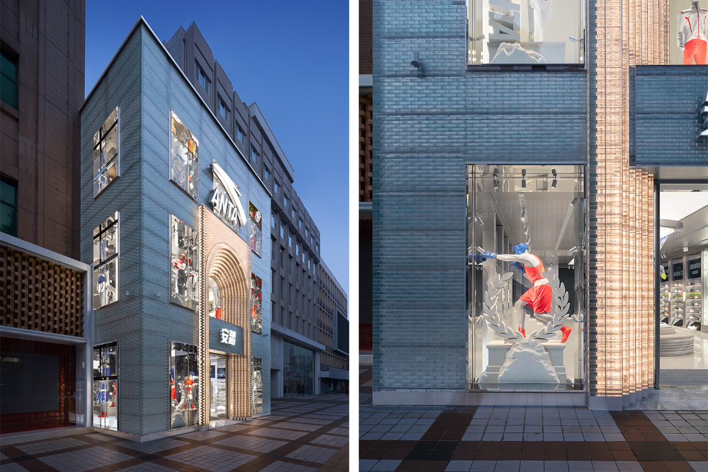 The store consists of over 500 square meters of three story space, themed around Olympics and technology, creating a futuristic and fashionable sports space. The exterior design extracts localized elements, based on the ancient material of bricks, and integrates a sense of technology to evolve into transparent glass bricks. This element has also become one of the main themes of the space. The imagery of the central arch blends the spirit of Olympic sports, combining the Beijing Desheng Arch with the Paris Arc de Triomphe. The unique runway design symbolizes the light of victory, and the nine storefront models on the front present a podium with a spotlight effect, representing the close connection between the brand and the Olympics and interpreting ANTA's brand personality of "KEEP MOVING" that never stops.