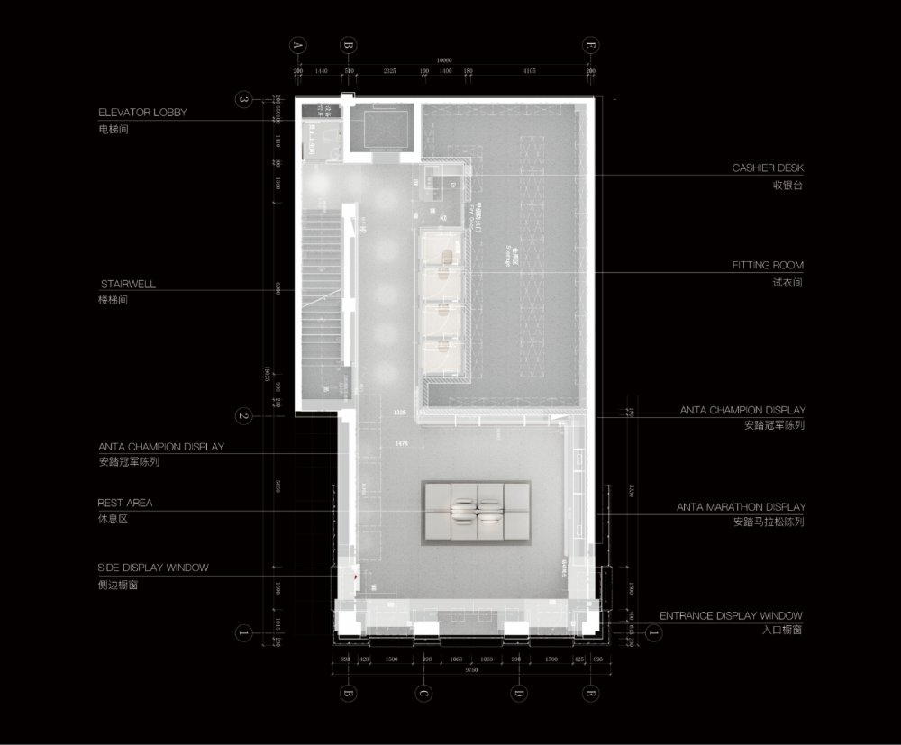 该店铺由超500平方米的三层空间组成,以奥运和科技基因为主题,创造未来感和时尚感并存的运动空间。外立面设计提炼在地化元素,以砖块这一古老材质为基础,融合科技感演变为透明玻璃砖,这一元素也化为空间的母题之一。中心拱门的意象融合奥运体育运动精神,将北京德胜门和巴黎凯旋门结合。独特的跑道线设计象征着胜利的光芒,正面的9个橱窗模特以领奖台呈现配合聚光灯效果,代表了品牌与奥运的紧密连接,诠释安踏“永不止步 KEEP MOVING”的品牌个性。