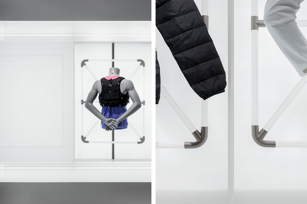 二层陈列各类专业运动服装装备,首先在空间内置入金属和气囊模块,半通透的材料及竖直线条的表达营造出未来感十足的环境,同时结合安踏环保材料的展示,将氦气技术融入陈列架的设计。该空间还有为品牌定制的独特细节,以展现陈列设计上的灵活性和可变性。如侧面展示架采用灵活的A柱,利用板材的拼缝可做活动调节。