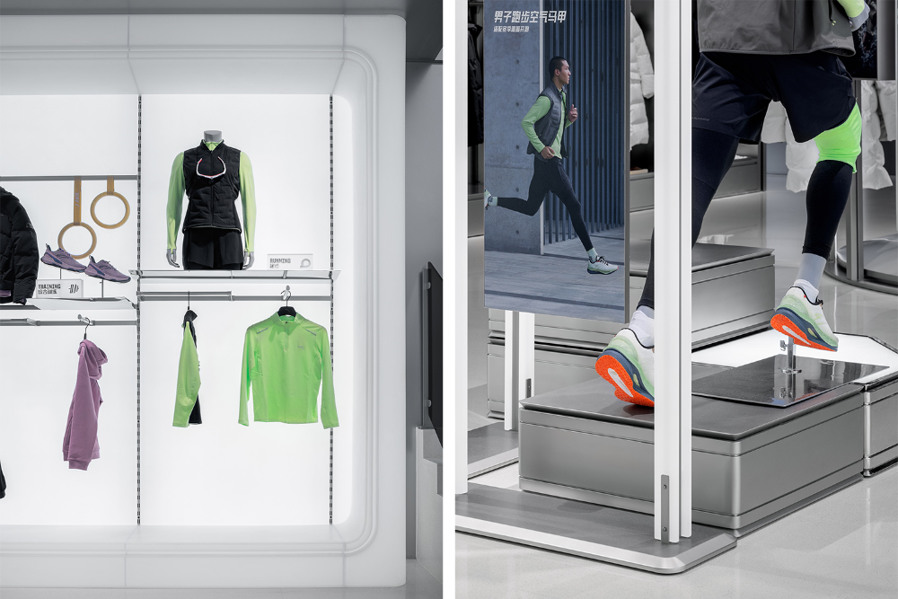 On the second floor, various professional sportswear and equipment are displayed. Firstly, metal and airbag modules are embedded in the space, creating a futuristic environment with semi transparent materials and vertical lines. At the same time, combined with the display of ANTA environmentally friendly materials, helium technology is integrated into the design of the display rack. The space also features unique details customized for the brand to showcase the flexibility and variability in display design. The side display rack adopts flexible A-pillars, which can be adjusted by using the joints of the boards.