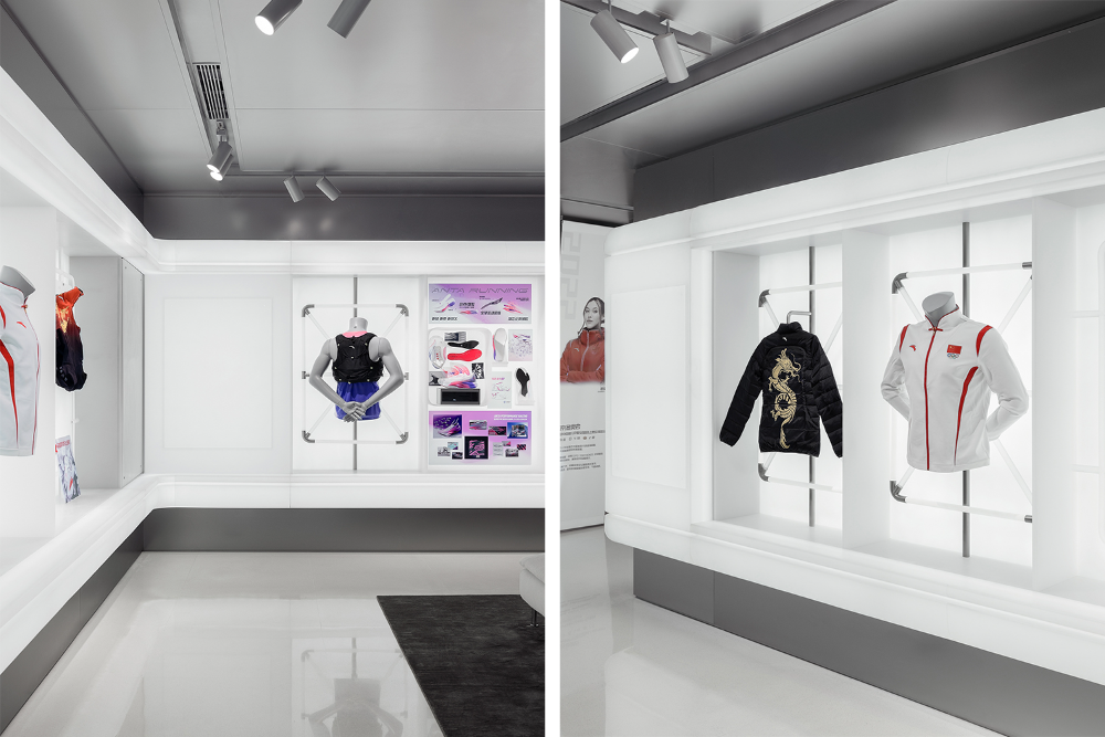 三层是安踏运动博物馆的陈列空间,该空间设置沙发休息区,磨砂亚克力的朦胧感和白色的灯光渲染出温润庄严的殿堂感。墙面照片展示安踏的历史和奥林匹克运动的重要瞬间,以及运动员的成就和故事,同时设置主推运动产品的展示区域。顾客可以亲身体验这些创新产品,了解安踏在科技和设计方面的卓越工作,让顾客更深入地了解运动和安踏的价值观。