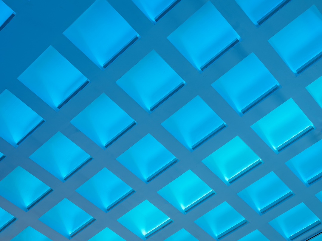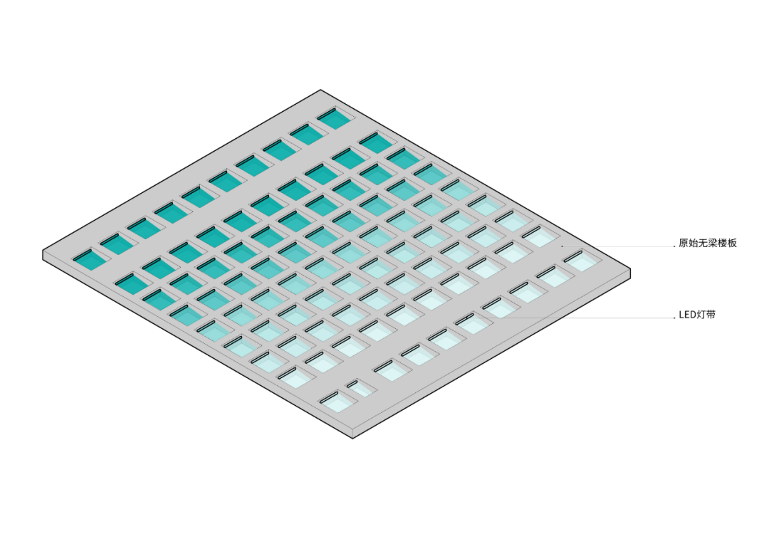 这个无梁楼板的方格设计非常精彩,它所营造出的秩序感令人惊叹。在高级的设计中,顺水推舟、顺势而为是非常重要的。因此,设计师在每个方格中安置了一条变色灯带,通过打亮方格的空腔来突出其空间感。此外,每一个空腔还设计了一道背光线,进一步增强了其空间感,整体顶部呈现出一面统一的秩序感。