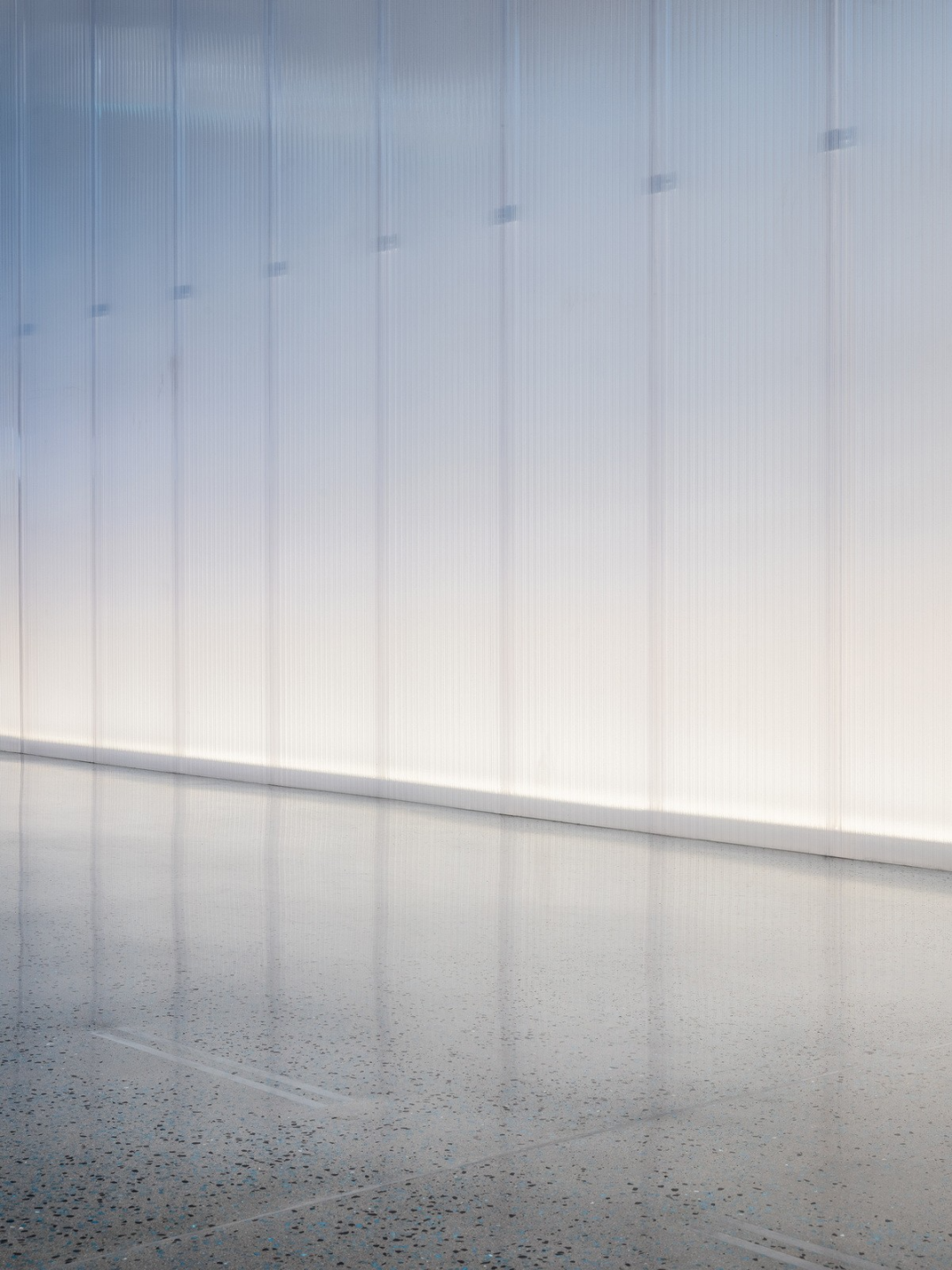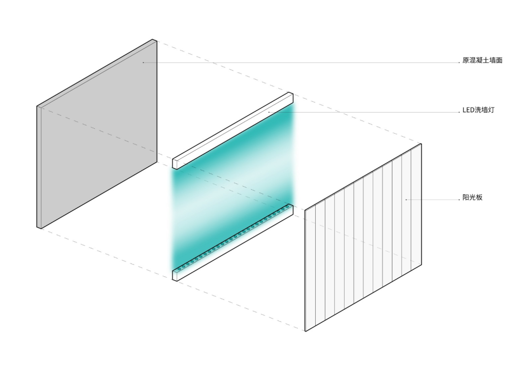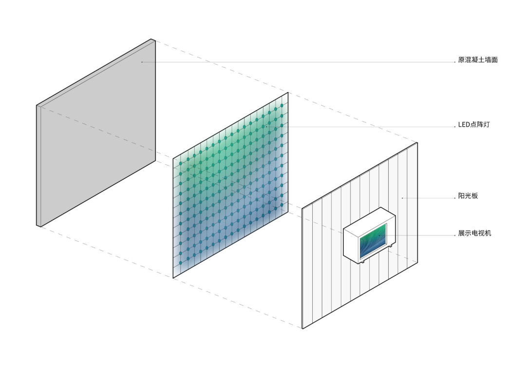 裸筑一直坚持“美来源于秩序中的惊鸿一瞥”的设计理念,这是人类经过教育后形成的审美取向,具有共识性和技巧性。在之前的项目中,我们成功地将这一理念应用于设计中,如礼和拱券的纪律和泰合玺红砖的构造秩序等,这成为了我们设计的保障。但是,我们希望能够找到这一理念的对立面,探索新的创新方式。在这个项目中,我们希望通过电子的无序来对抗物理的有序,与过去电视机的工业设计的“造形”以及现在液晶电视的“无形”产生共鸣。通过5mm阳光板的光透过呈现出一种混沌与无序的效果,让空间呼吸、跳动、共鸣,活灵活现,像人一样微弱地存在,既不显眼也不隐蔽。这是我们的一次人为尝试,试图让空间走向“好”的一面。