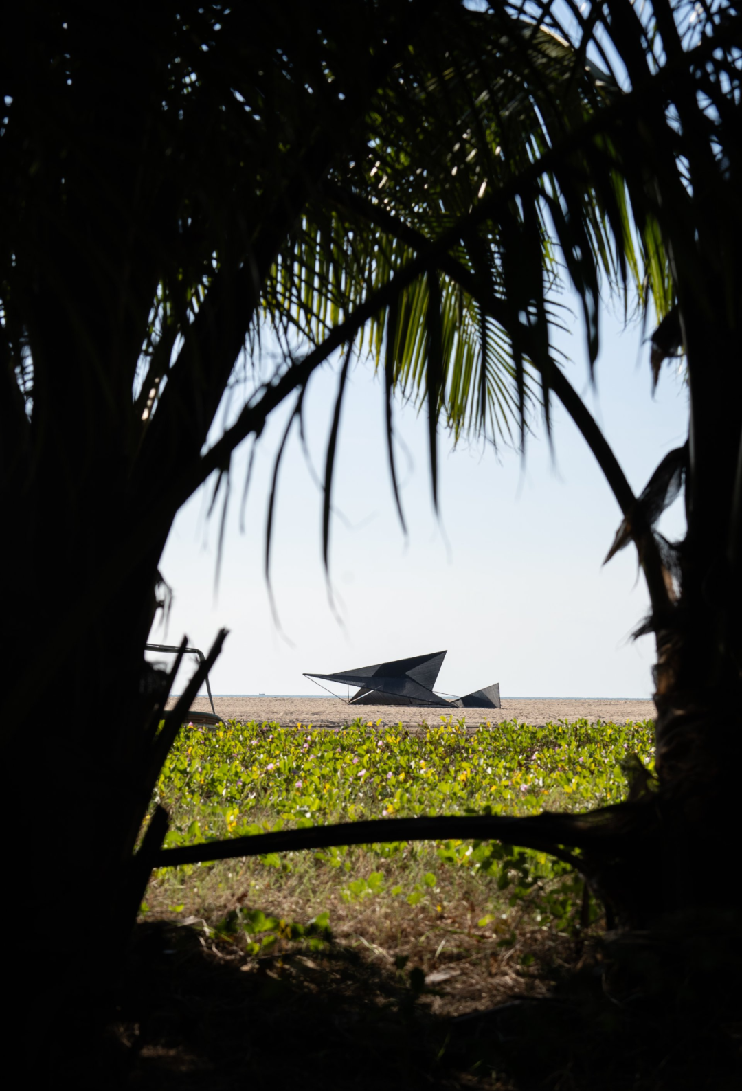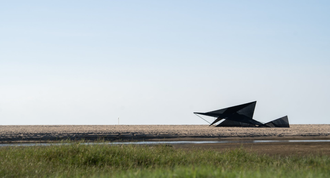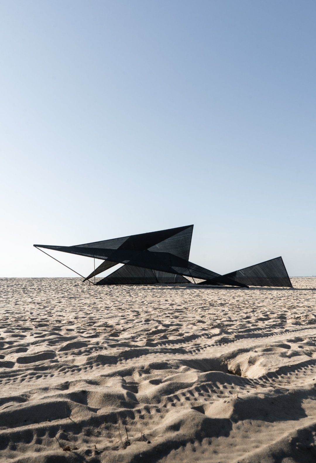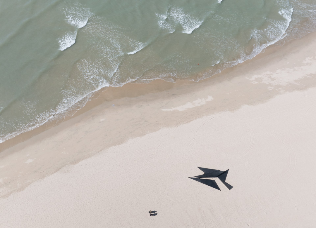 正午时分,从顶部俯瞰,作品似一只黑色的大鸟安静地伏于沙滩上,也如一艘太空飞船,承载着人类对自然的敬畏与创新的力量。我们希望这件作品唤起人们对生态保护的关注,以艺术的方式激发人们的思考:如何在现代生活中实现人与自然的和谐共存。