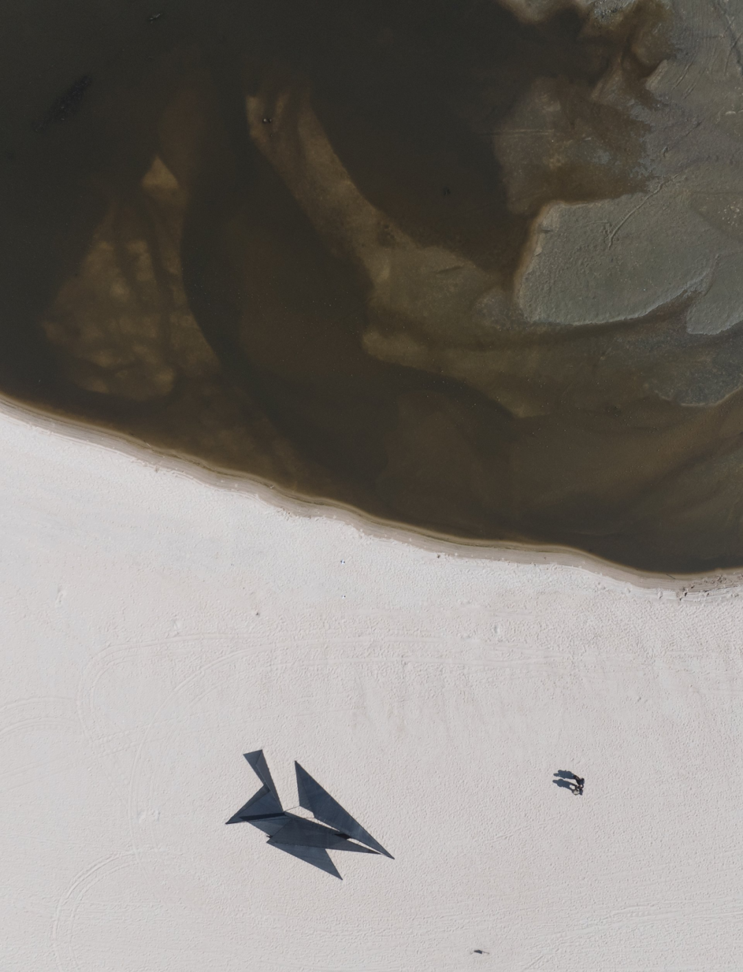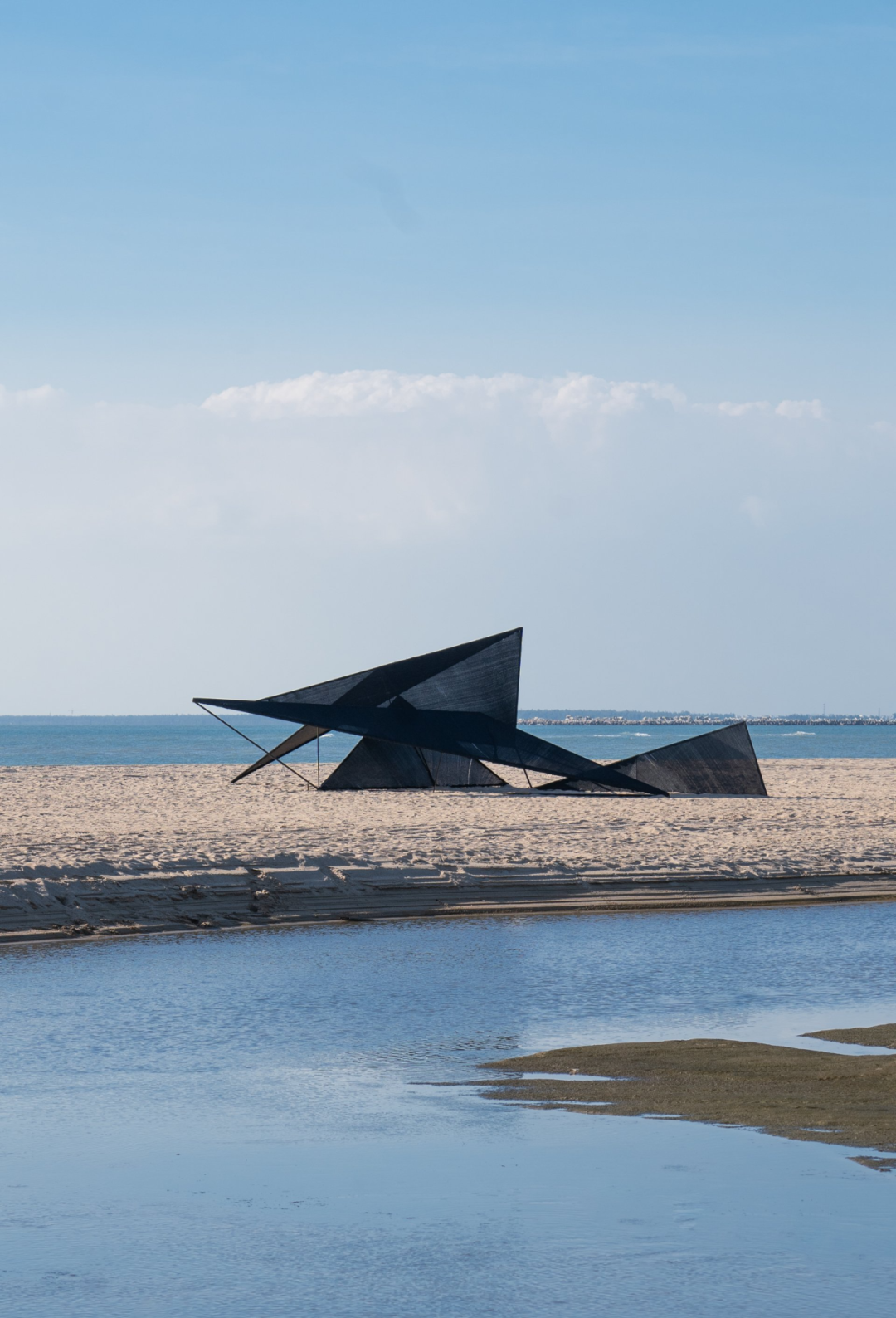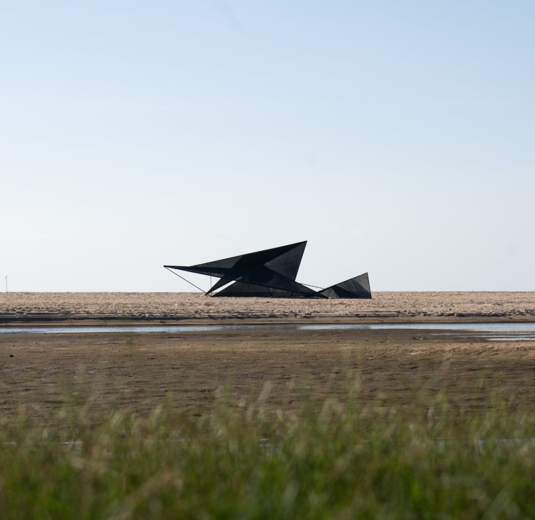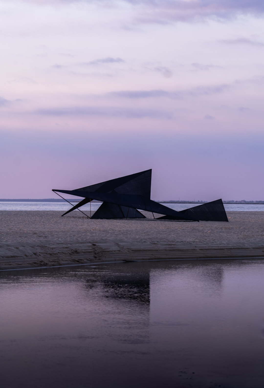 正午时分,从顶部俯瞰,作品似一只黑色的大鸟安静地伏于沙滩上,也如一艘太空飞船,承载着人类对自然的敬畏与创新的力量。我们希望这件作品唤起人们对生态保护的关注,以艺术的方式激发人们的思考:如何在现代生活中实现人与自然的和谐共存。