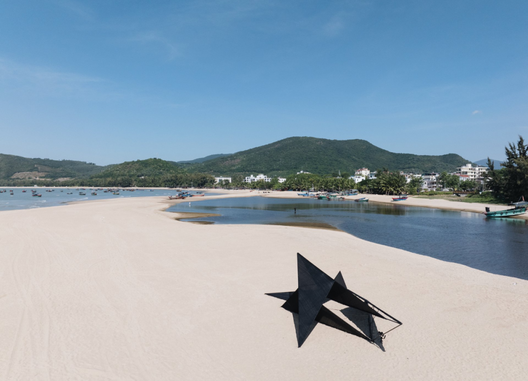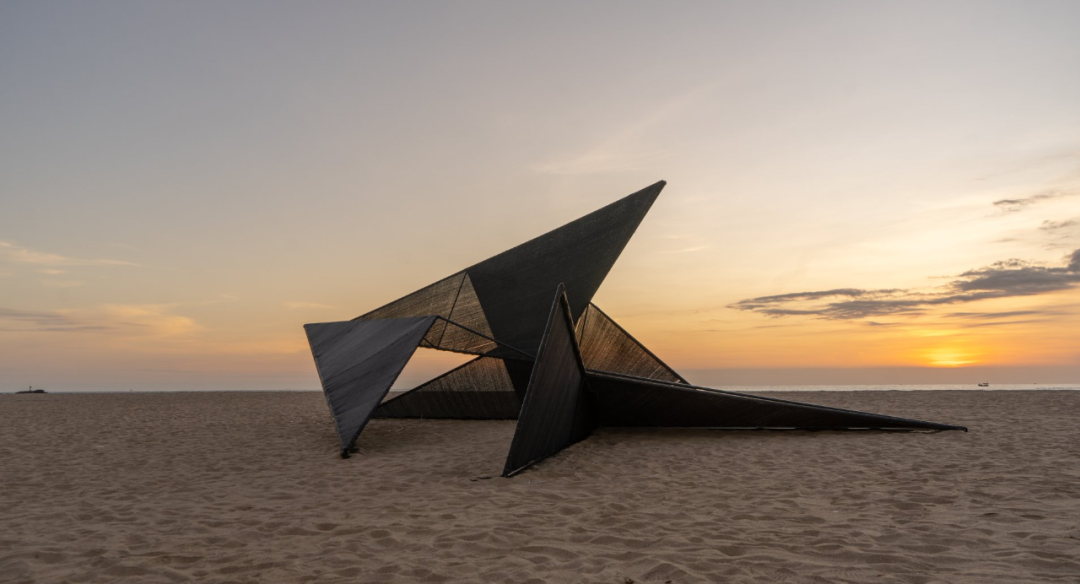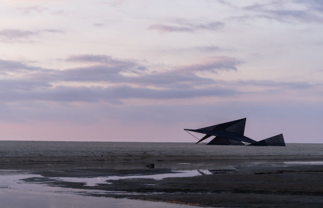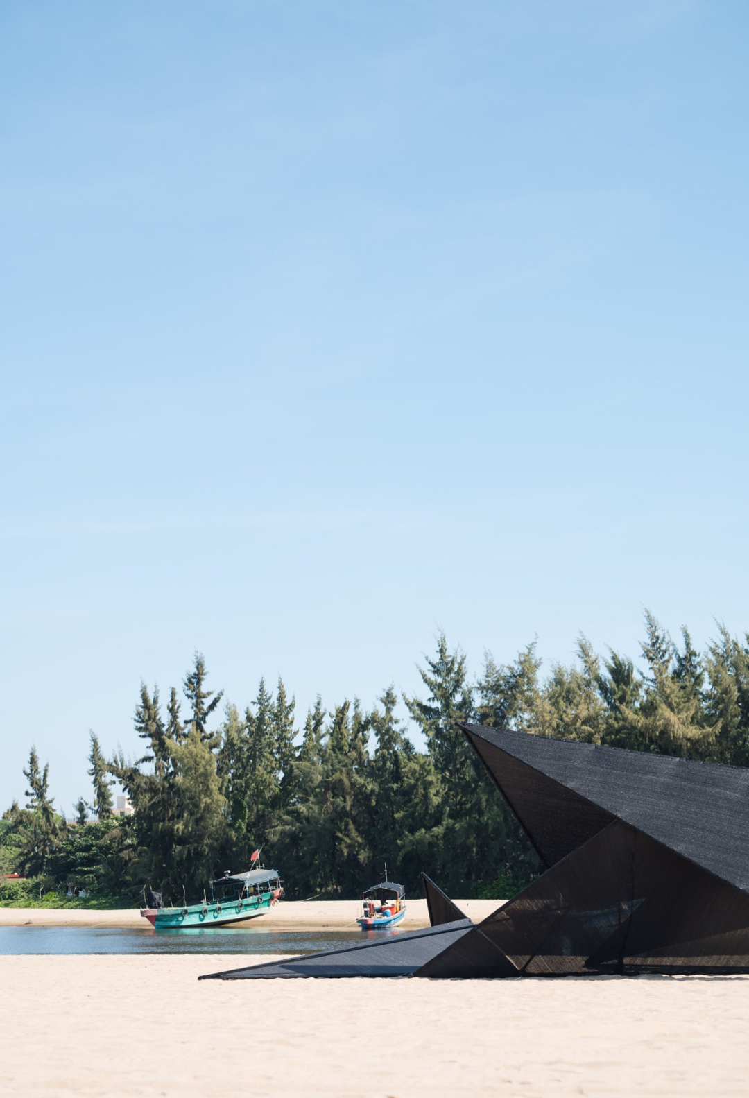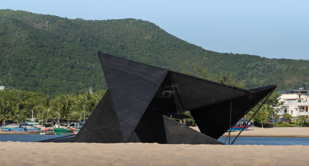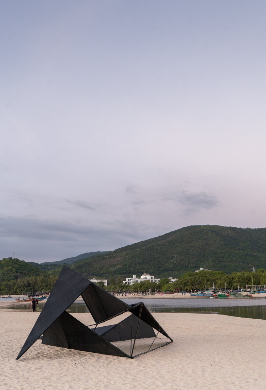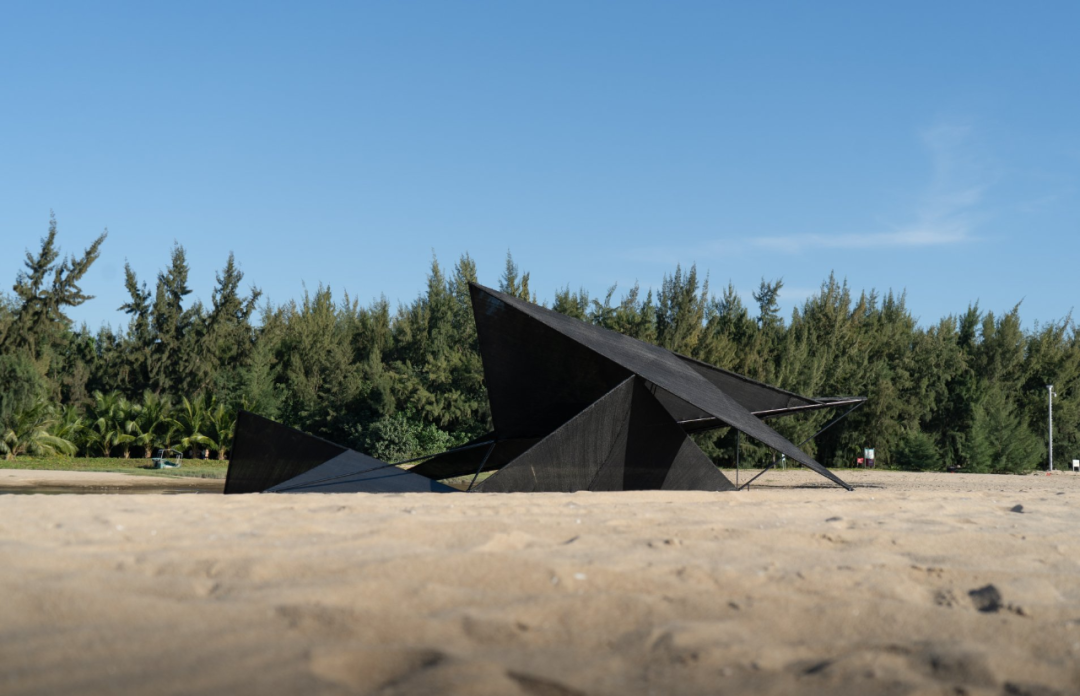 The overall shape of "OAS/S-VESSE" is full of futuristic and powerful sense. The overall shape is like a bird lying quietly on the ground, and it is like a spaceship from the future, which combines the visual tension of nature and the future. The work is mainly black, using the black sunshade cloth of local fishermen as the main material, combining ancient materials and skills with future technological imagination, reflecting the dialogue between "ancient and future", and conveying the power of deep connection between man and nature.