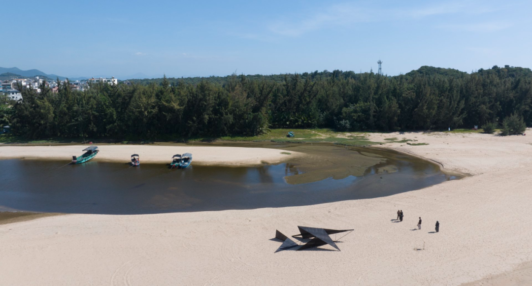 The north of the work is a gathering place for fishermen in the village. The black awnings and fishing boats are scattered along the coastline, which makes the work naturally echo with the fishing village. The unity of materials gives it a unique charm that blends in and stands out. The luster of the surface of the work in the sun echoes with the texture of the awning, as if it is an art that grows out of the lives of fishermen. It is like a part of the fishing village, but also like an existence that transcends daily life. Whether it stands quietly or is gently blown by the sea breeze, it tells the story of fishermen together with the surrounding scenes, perfectly combining the simplicity of life with the depth of art.