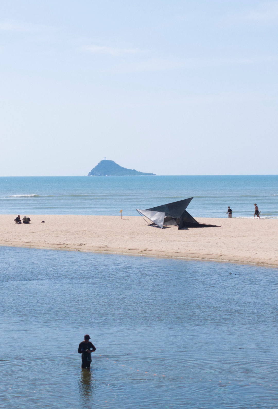 Looking from east to west, the work seems to blend into the ocean and the sky. The triangular structure is like a sail. The natural contraction and tension of the material make the work as a whole have both a sense of flow and a sense of power. The sunlight shines on the work and penetrates through the gaps, making the work seem to float lightly on the sea, showing the long history of fisherman culture and implying the exploration process of mankind setting sail from the ocean and constantly moving towards the stars and the sea.
