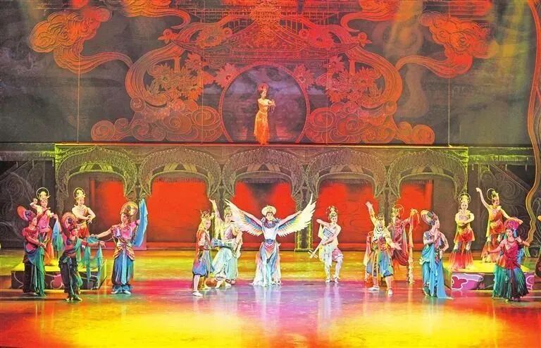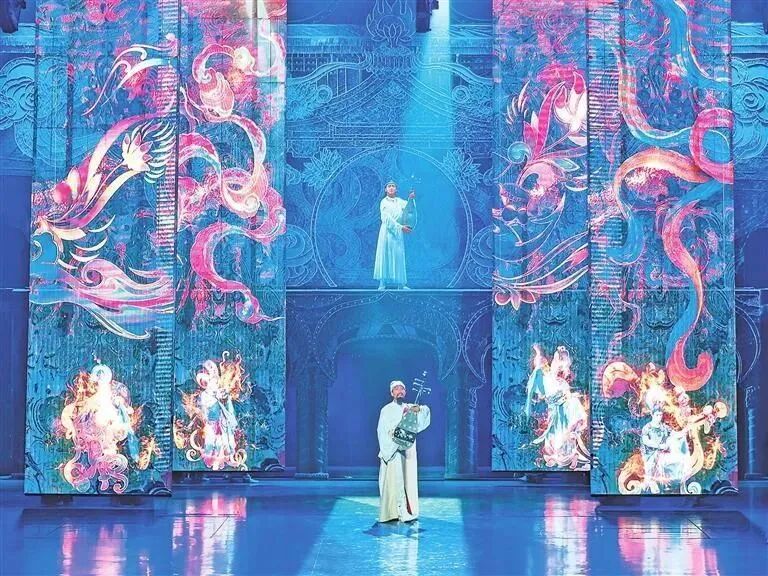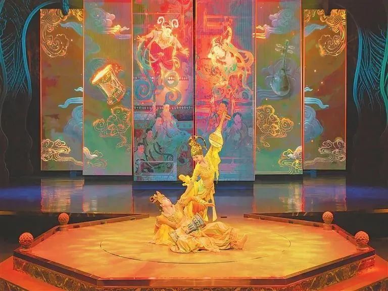在舞美结构、科技手段、数字技术的配合下,既能感受到强烈的视觉震撼,也能体验到逼真的洞窟穿越,让观众的感官情绪在观演过程中不断起伏变化,零距离地感受敦煌艺术中乐、舞、诗、画的璀璨繁盛。