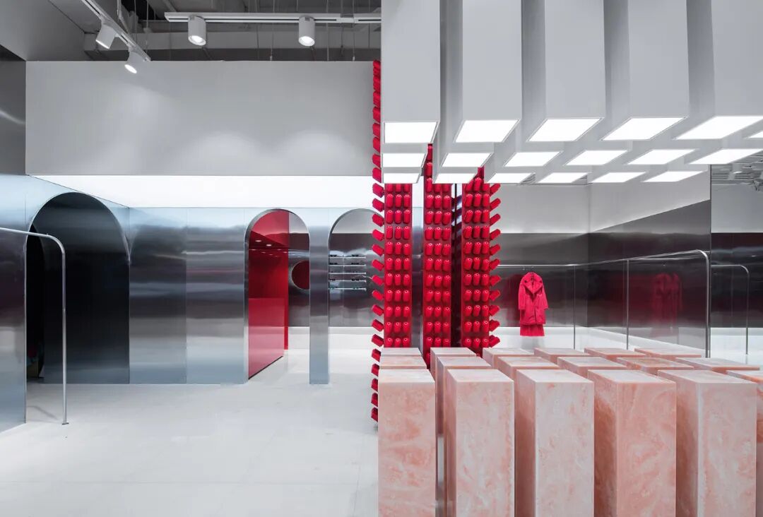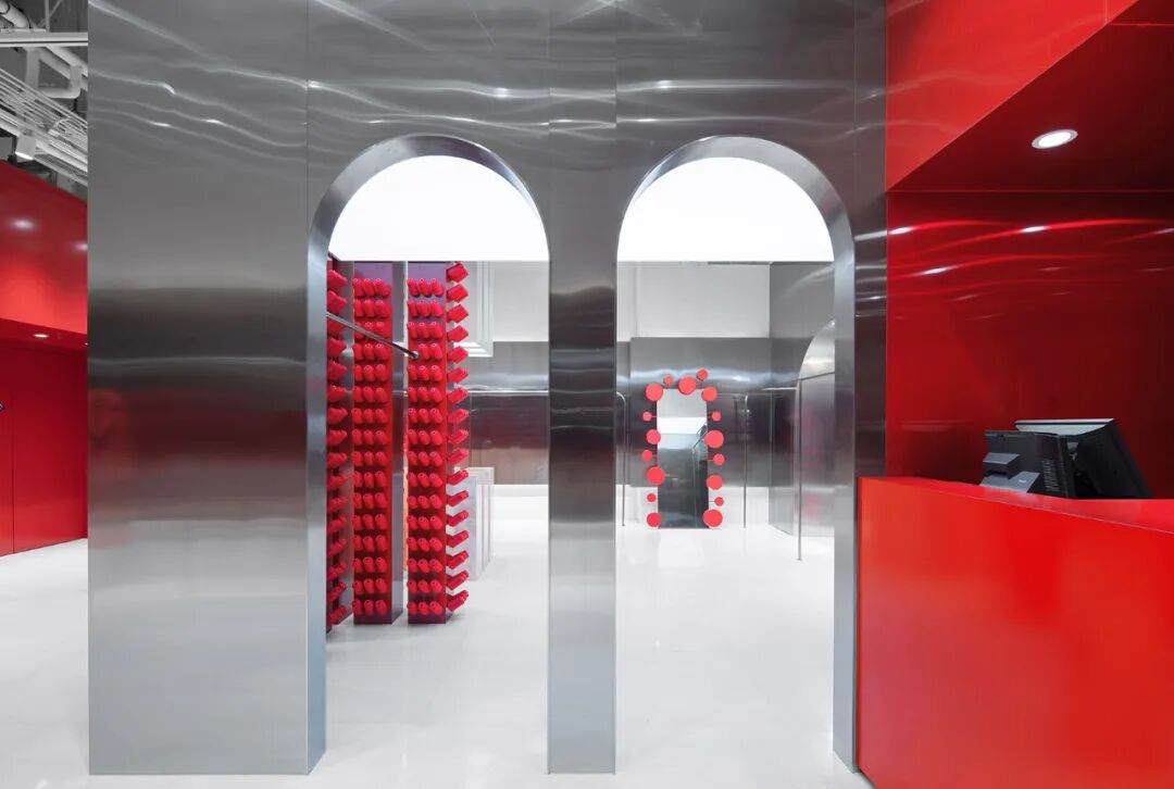 红色成为全新概念店的主角,搭配光感和未来气息的银色拉丝不锈钢墙面,形成简洁有力的背景,清晰地诠释了品牌“拒绝千人一面”的主张。简洁有力的设计手法突出了核心概念,而配角元素则以现代化建筑语言呈现,既烘托出强烈的主题氛围,又释放了空间的丰富性。