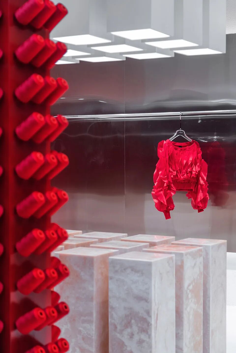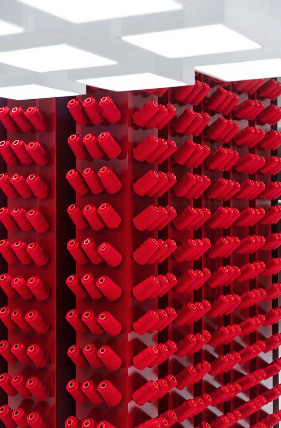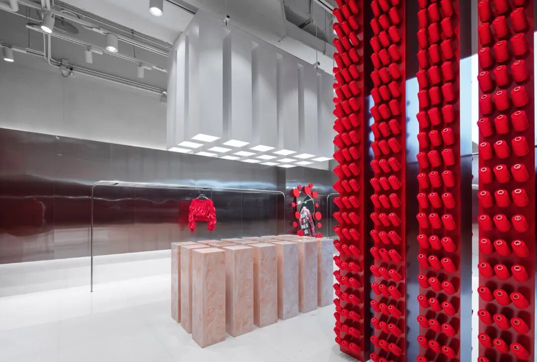 在空间中,梁海涛特意设计了一组装置艺术装置,如镶嵌于红色不锈钢立柱上的大红线轴(Red Thread)装置,以及展示服装之外饰品的粉色石柱,与顶部白色的灯柱相呼应,呈现出展品独有的质感与色泽。此外,圆弧形拱门的运用柔化了不锈钢材质的坚硬与冰冷,为空间增添了生趣。