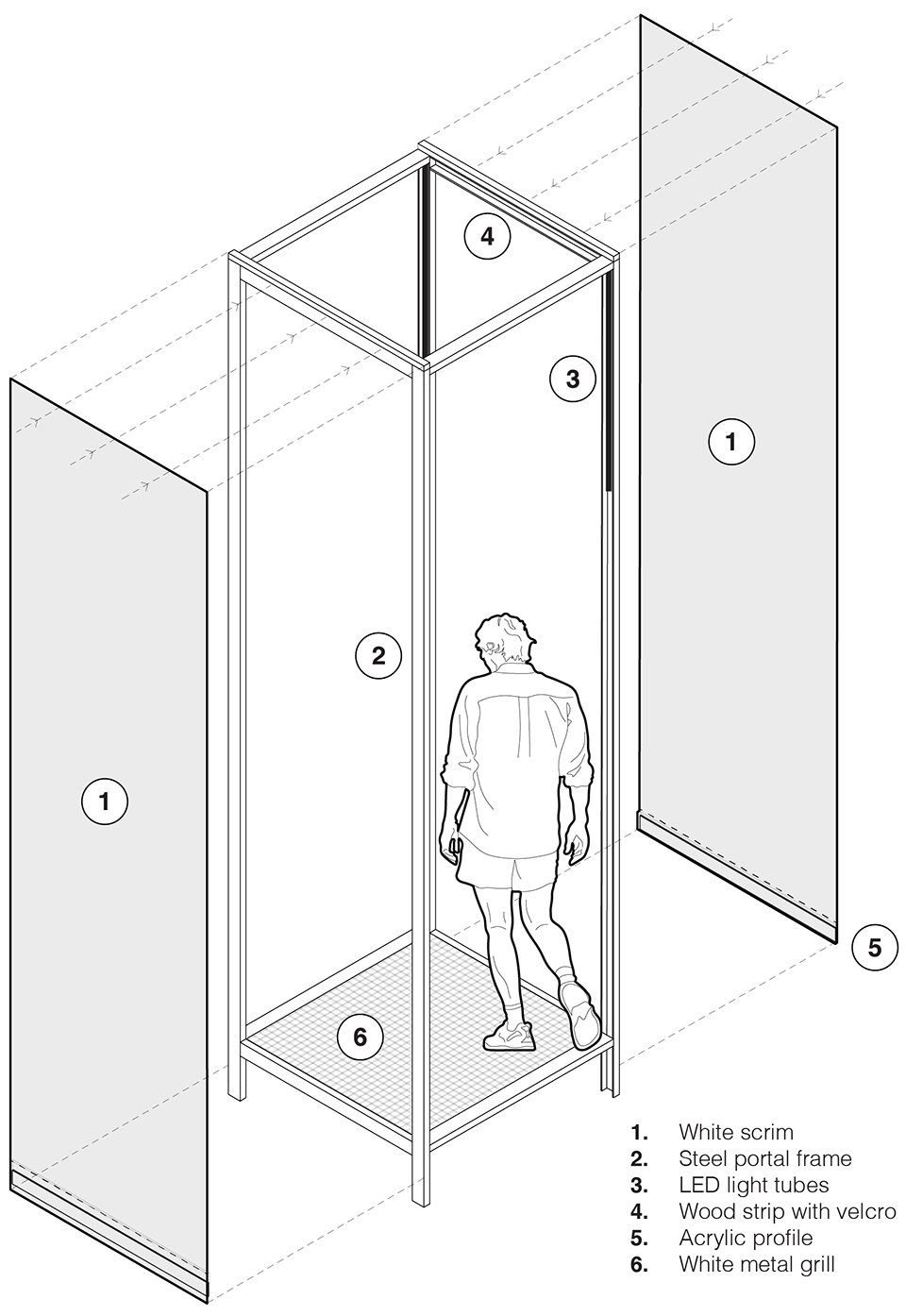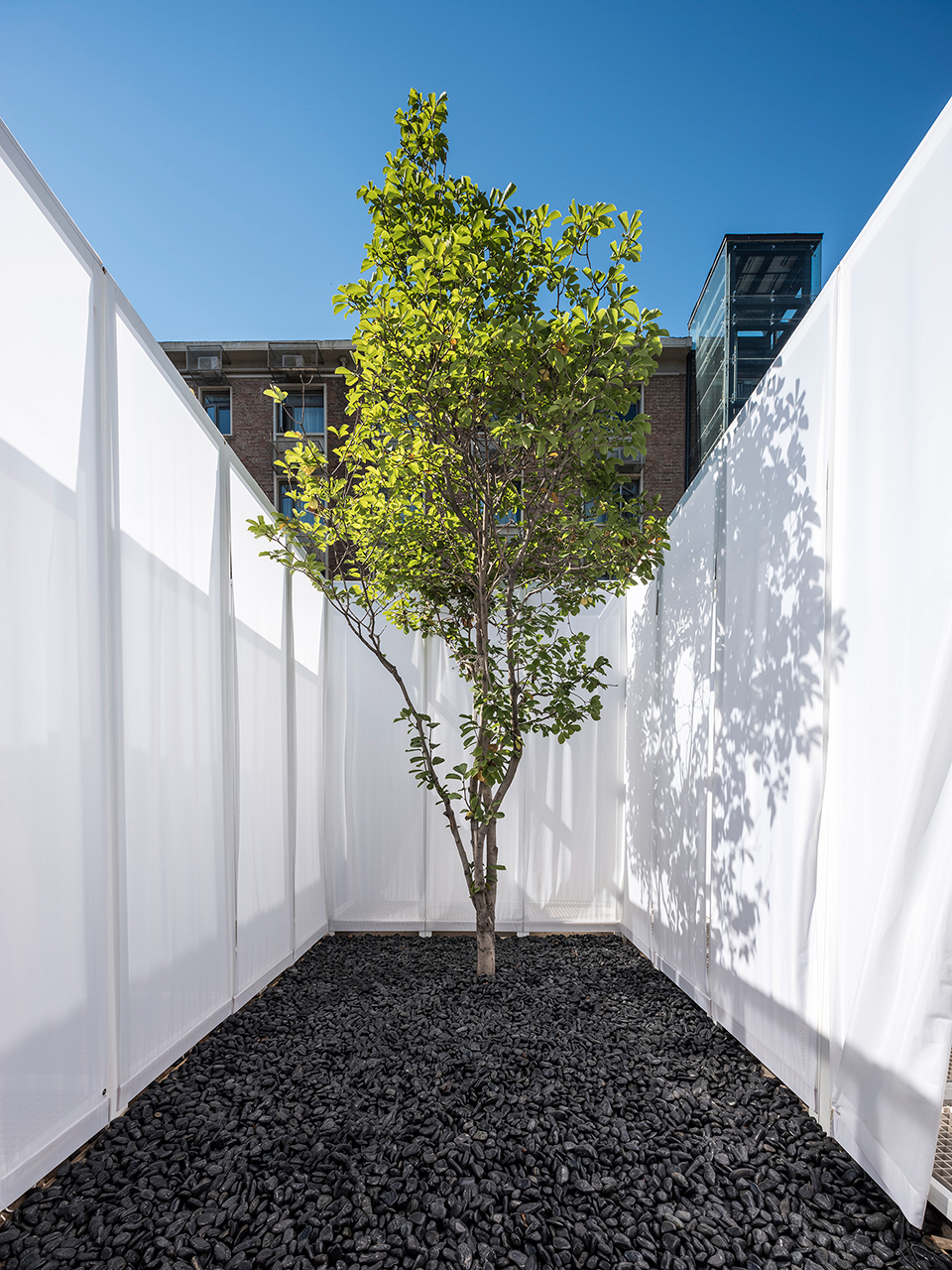 CO·贰是一个由光和烟雾构成的装置,它像棱镜一样坐落在庭院中央,增强并改善了庭院的对称比例。这个装置由26个方形型材组成,利用简单的螺栓和螺母连接在一个由3个不同模块组成的系统中。这些元素围合出一个向天空敞开的中庭,为游客提供了与庭院亲密接触的机会,同时周围的白色幕布则成为混乱的城市环境和庭院私密氛围之间的过渡区域。